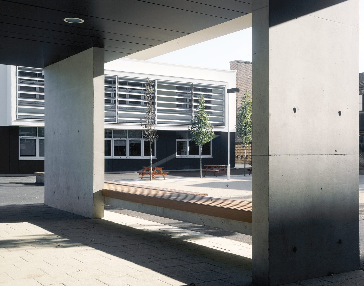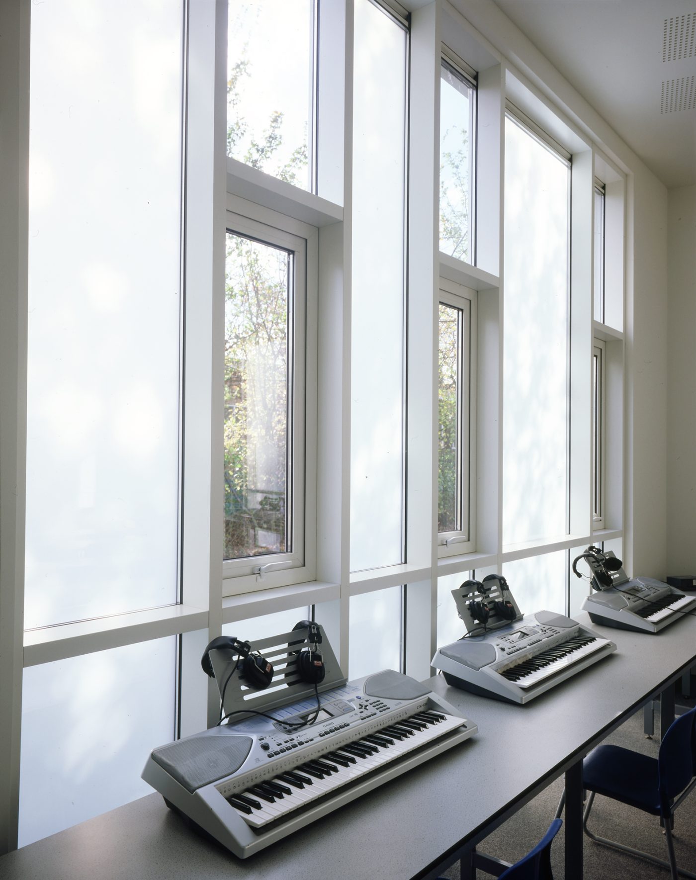 The project had ambitious sustainability objectives too. The buildings are naturally ventilated and passive heating and cooling is supplied by a ground coupling well field. In warm weather the ventilation chimneys in the main teaching block are assisted by fans driven by PVs on the roof. The design exemplifies our approach to careful environmental design and appeared as a case-study in the RIBA publication "Sustainable Architecture".