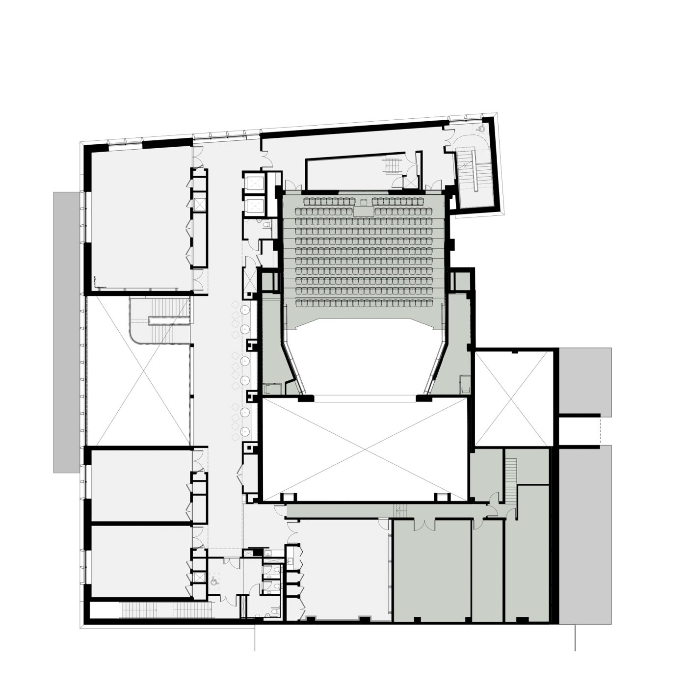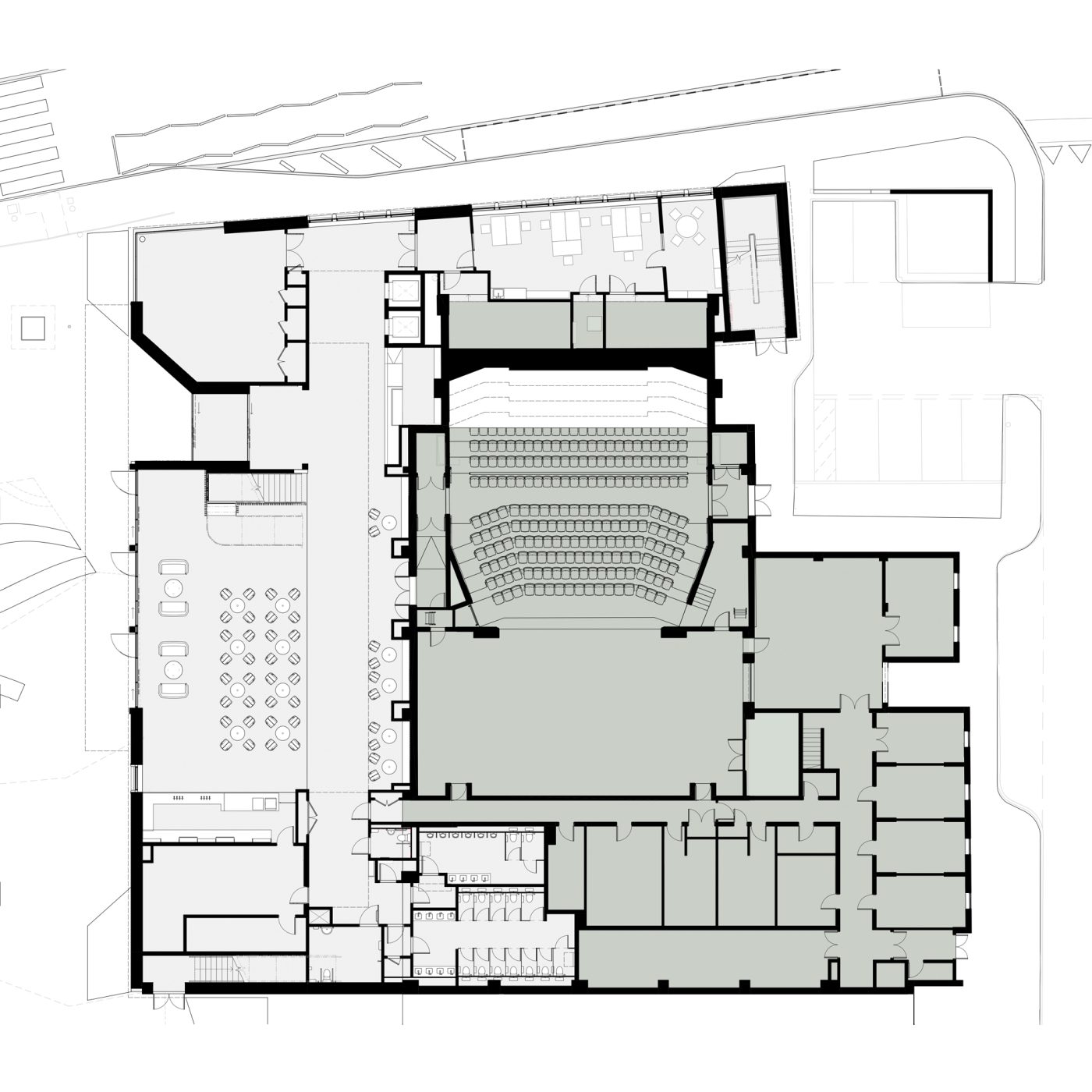 The proposed works involve the demolition of the existing front of house areas to provide space for an extension providing a new public foyer and café/bar, new studios, office space and WC facilities. The auditorium will be refurbished to increase seating capacity, and improve accessibility and sightlines. The existing problematic roof covering will be replaced with a robust standing-seam zinc.