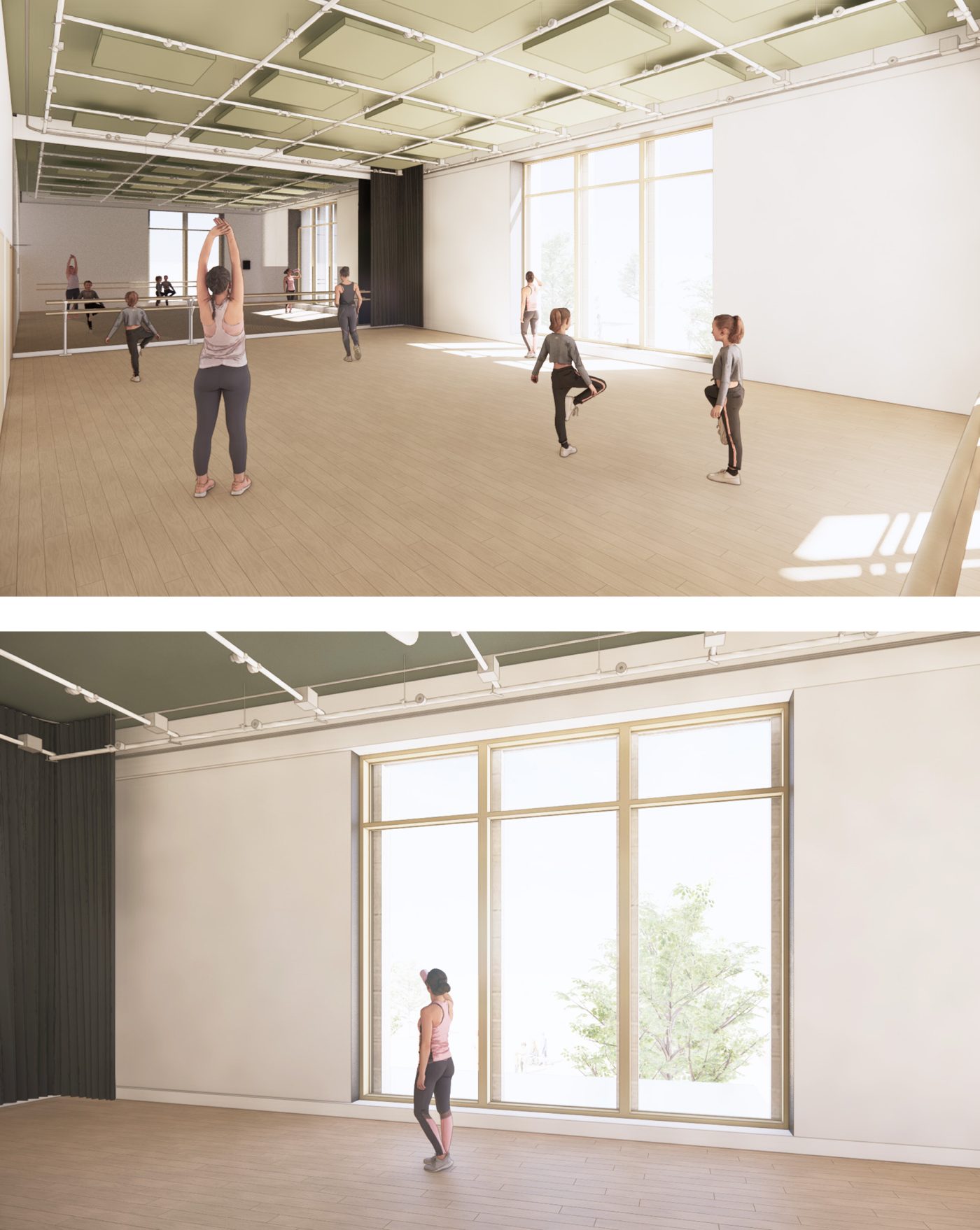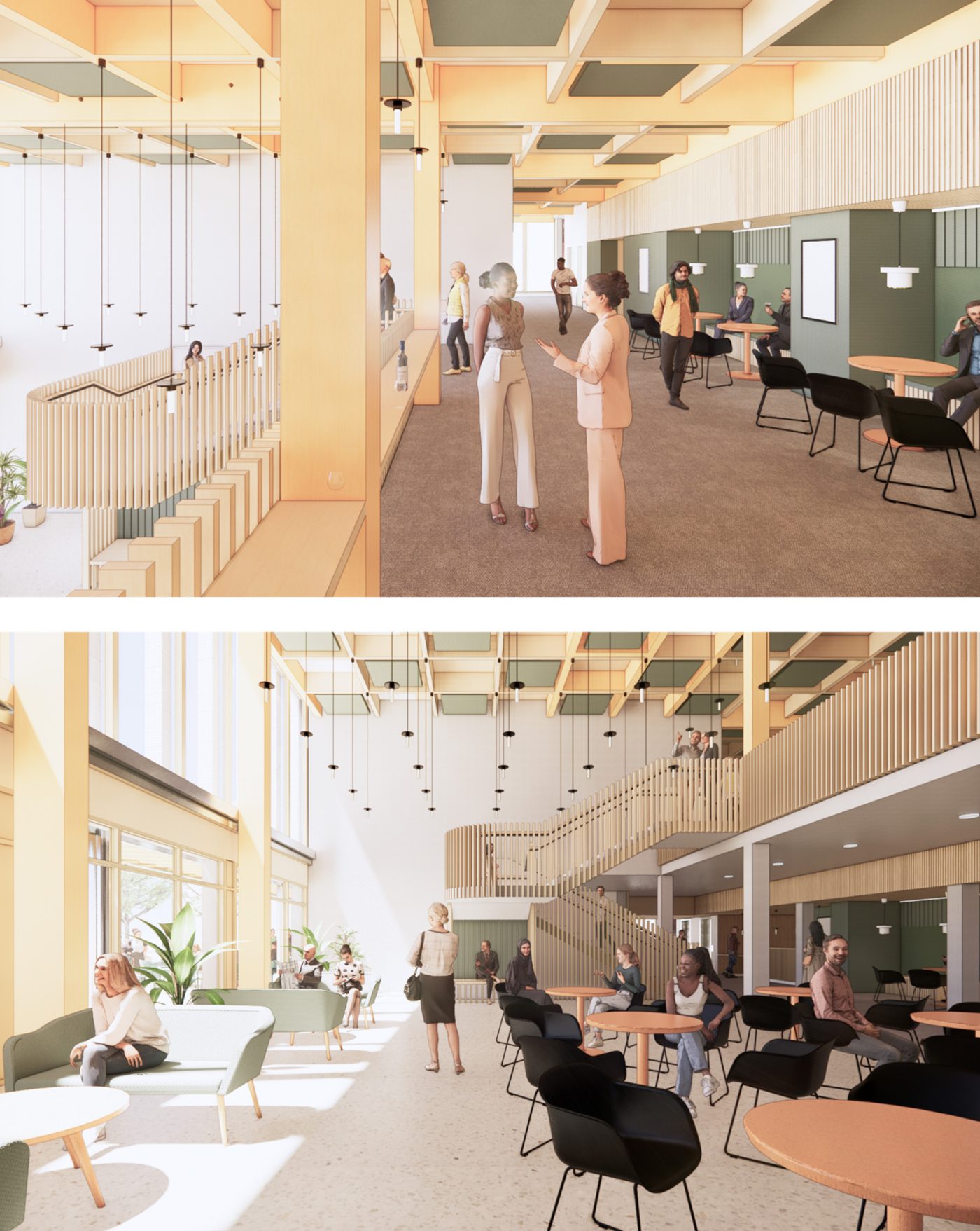 Internal materials are largely self-finished to reduce applied finishes and reduce embodied carbon. Within the foyer the structure is exposed providing warmth in the form of exposed timber, and thermal mass in the form of insitu concrete. Windows and curtain walling have timber internal framing to complement the timber structure. The studio spaces are designed as box-within-box acoustic enclosures with internal acoustic paneling and hardwood sprung floors. Further timber and woodwool paneling provide acoustic absorption within the foyer, and the auditorium is re-lined internally with hardwood acoustic slats. Terrazzo and ceramic tiling complete the high-quality palette of materials to the foyer café space, with carpet tiling to circulation areas to enhance acoustic comfort.