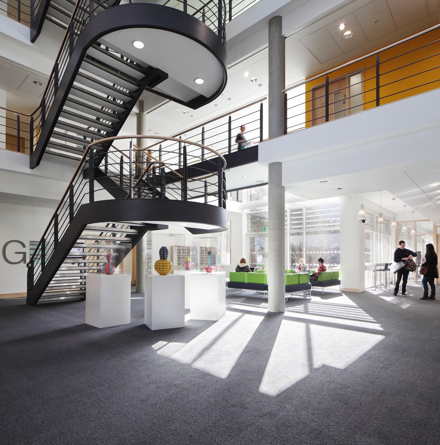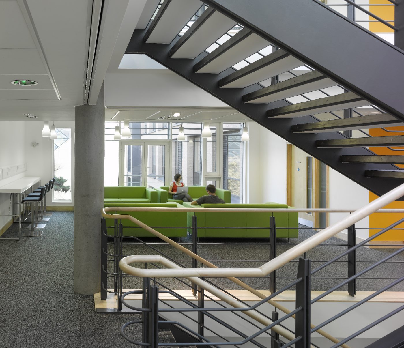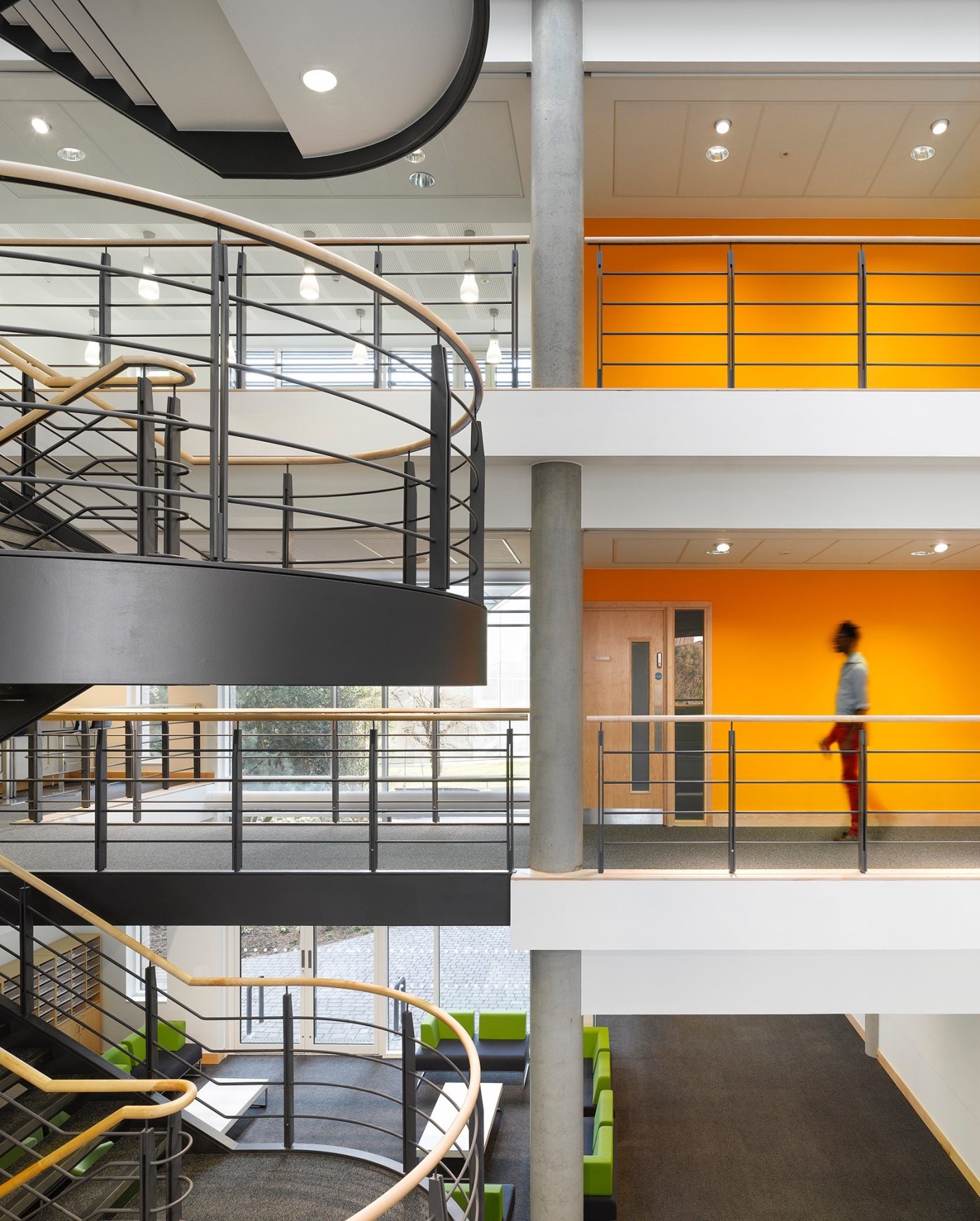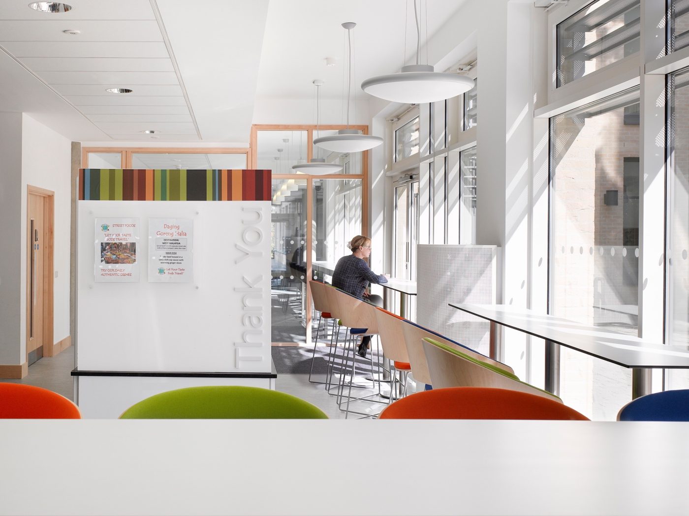 The atrium with its clusters of seminar rooms and shared informal meeting areas acts as the centre for collaboration whether planned or serendipitous. The ground floor seminar rooms, exhibition space and café are open to wider site users encouraging interaction with neighbouring departments too.