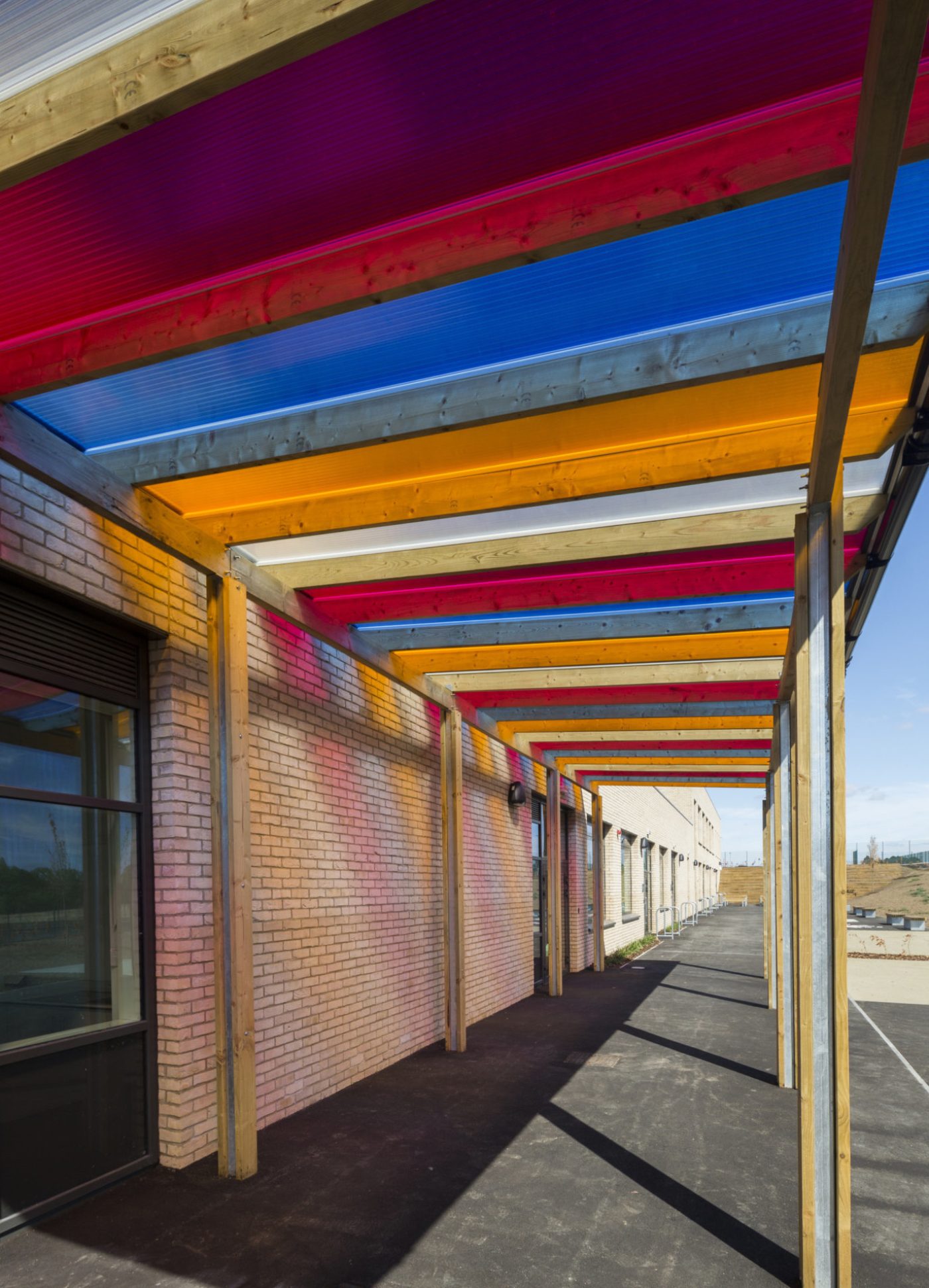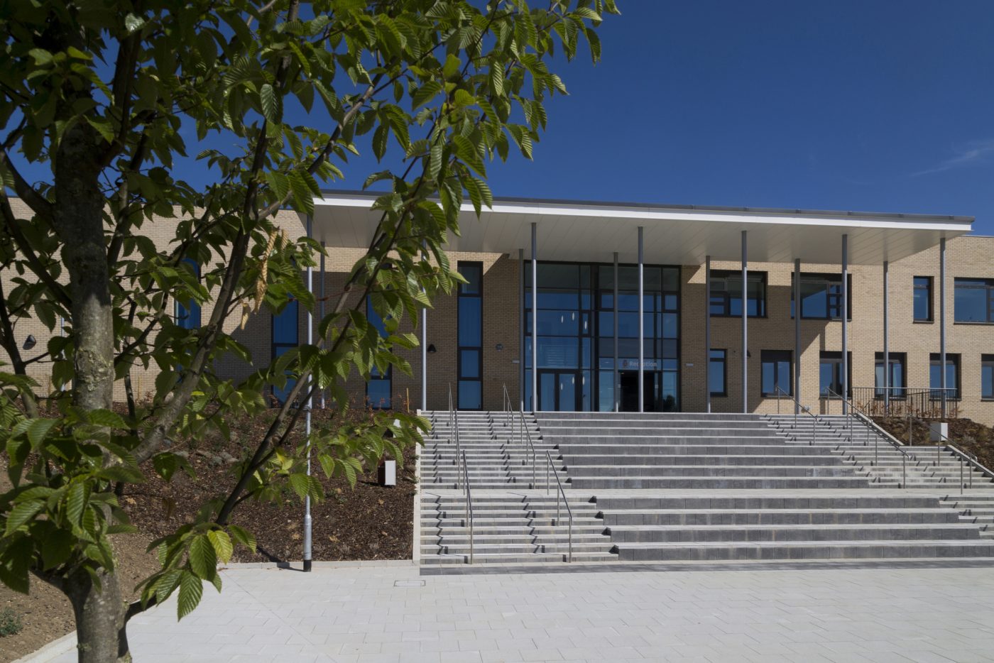 The secondary school courtyard provides a strong sense of identity and orientation, and the long entrance canopy and front steps give prominence to the regular façade and suggest the importance of the academy within its community.