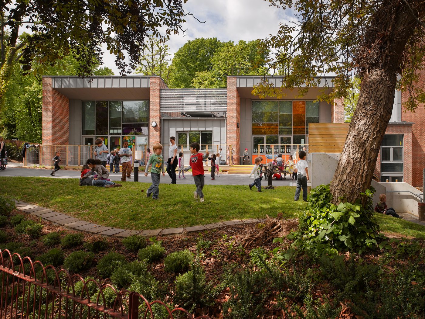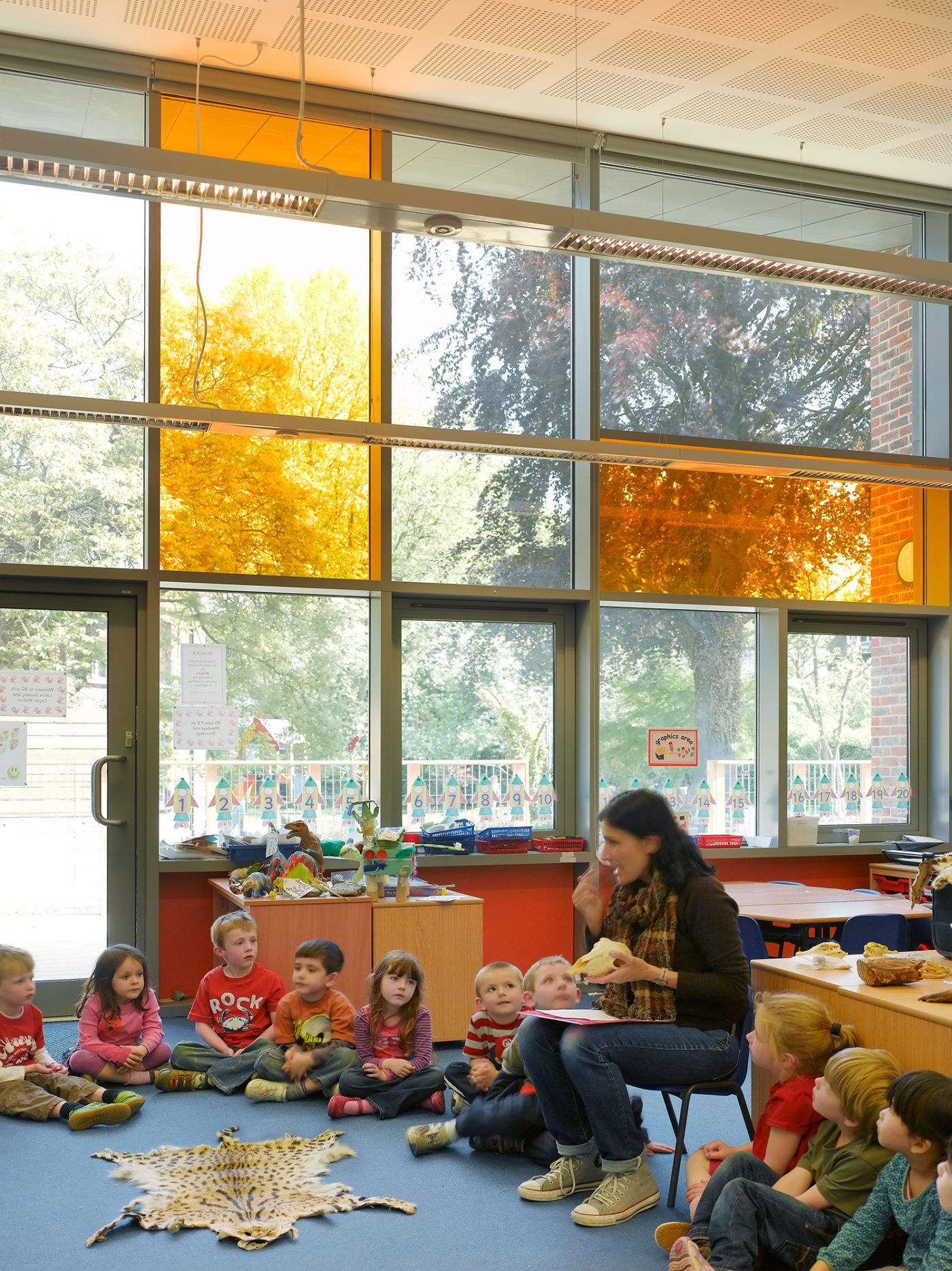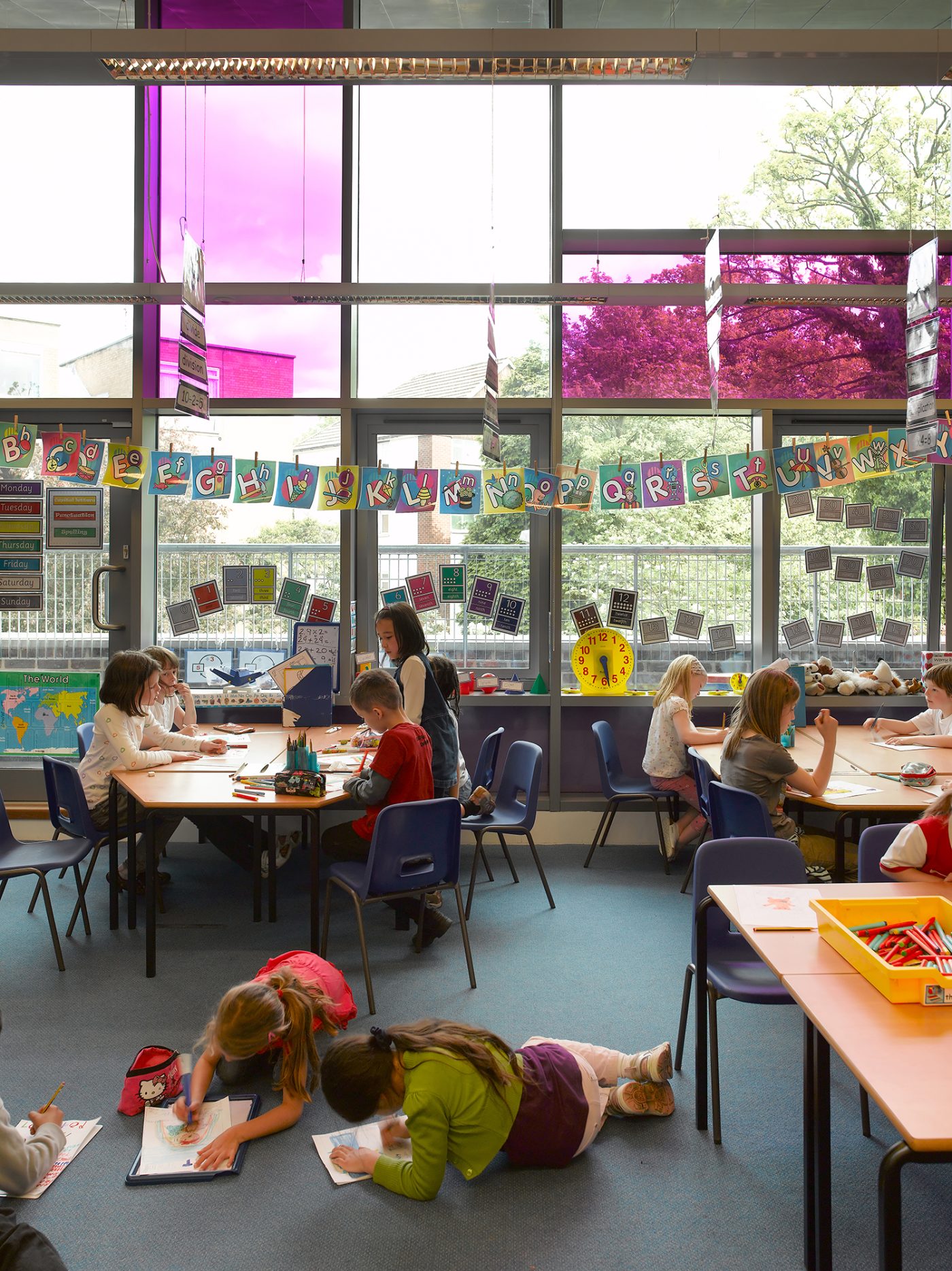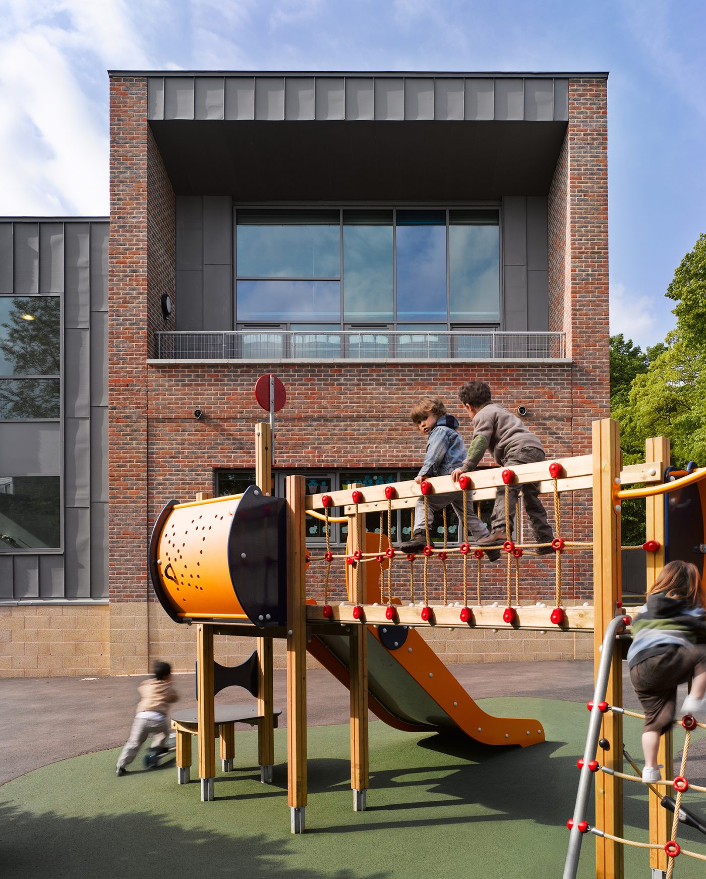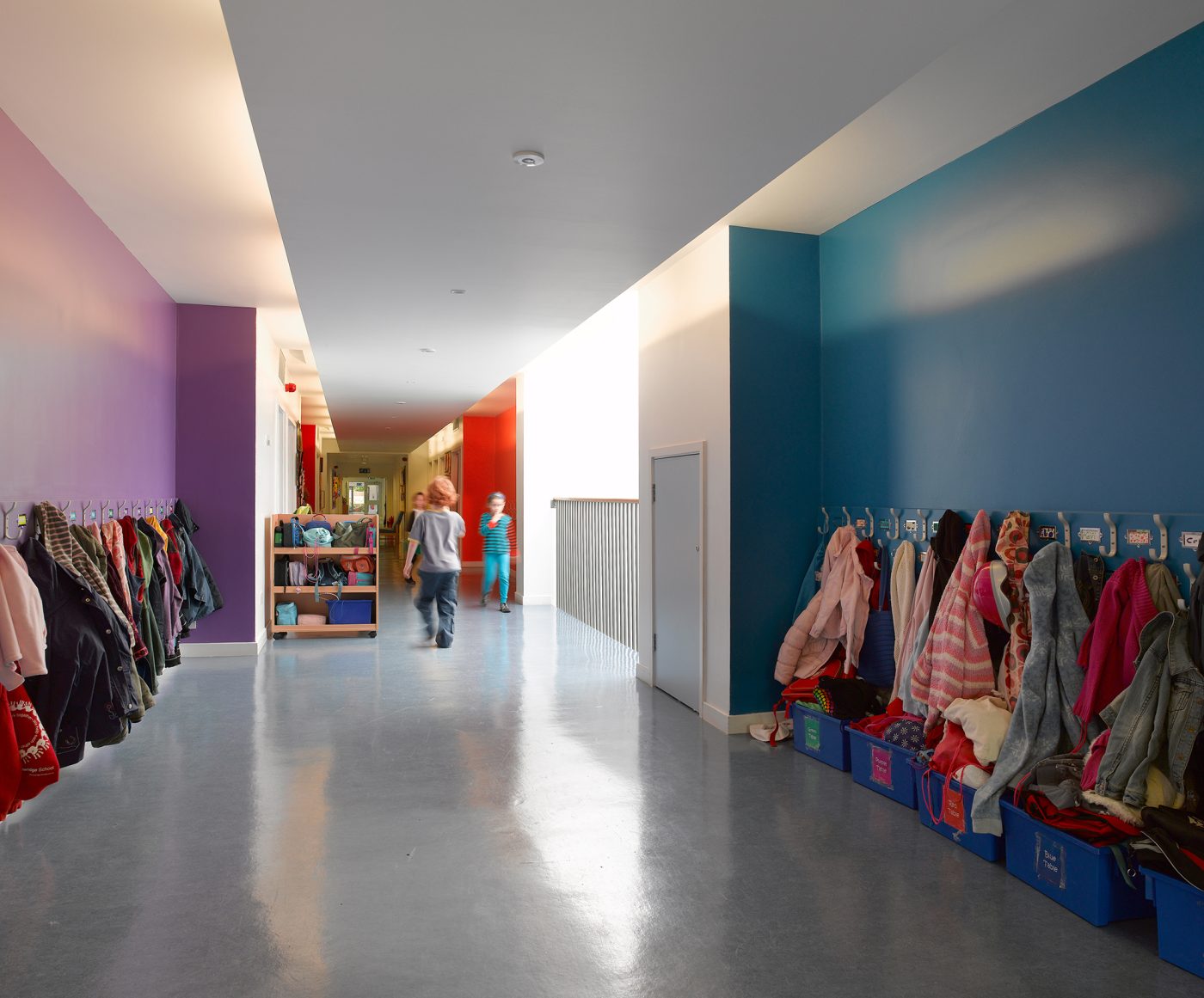 The retained building contains the main hall and shared teaching facilities as well as a nursery adjacent to the new reception wing. The proposal was developed to accommodate the slope of the site yet create a completely accessible environment for the children both internally and externally.