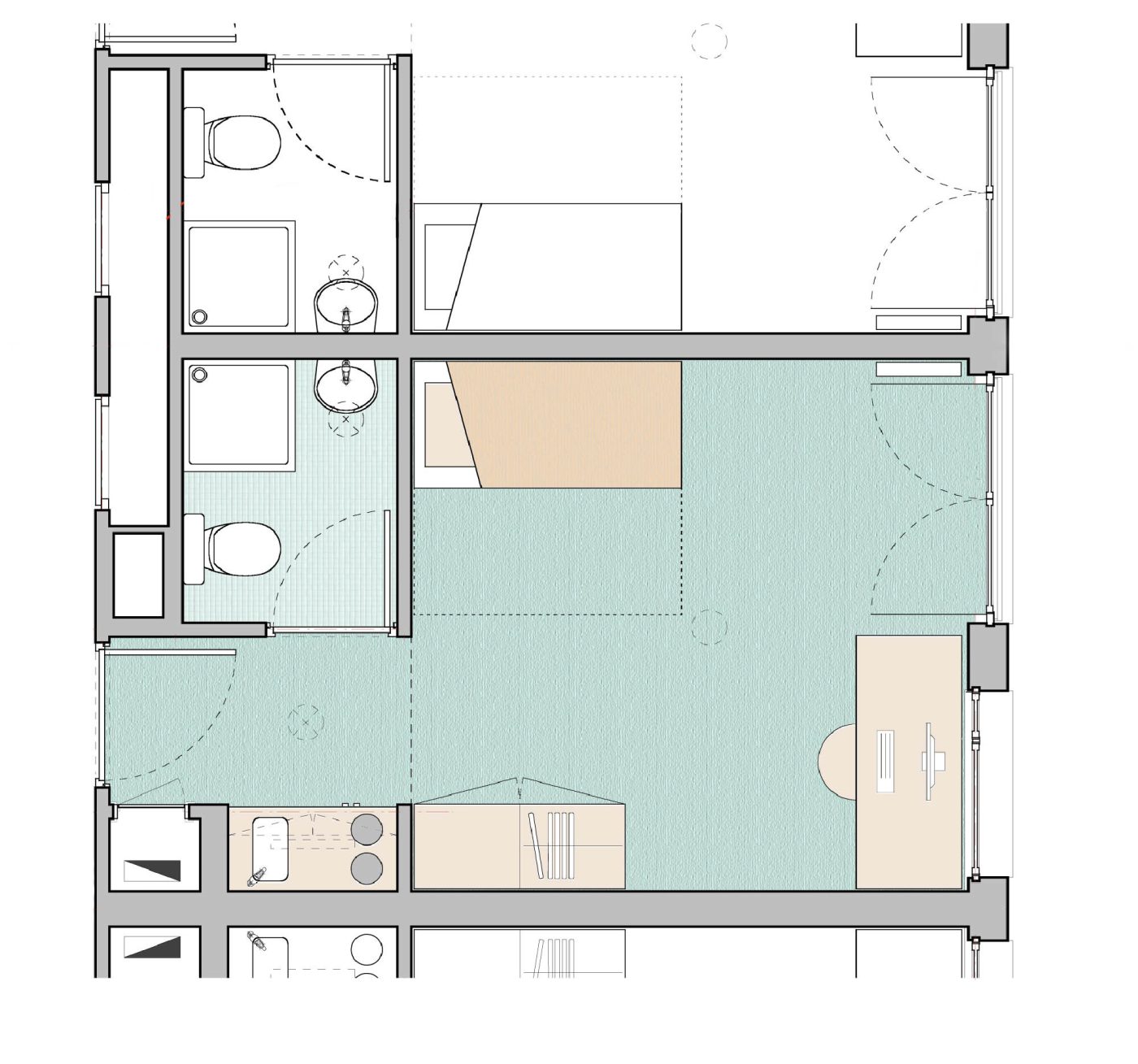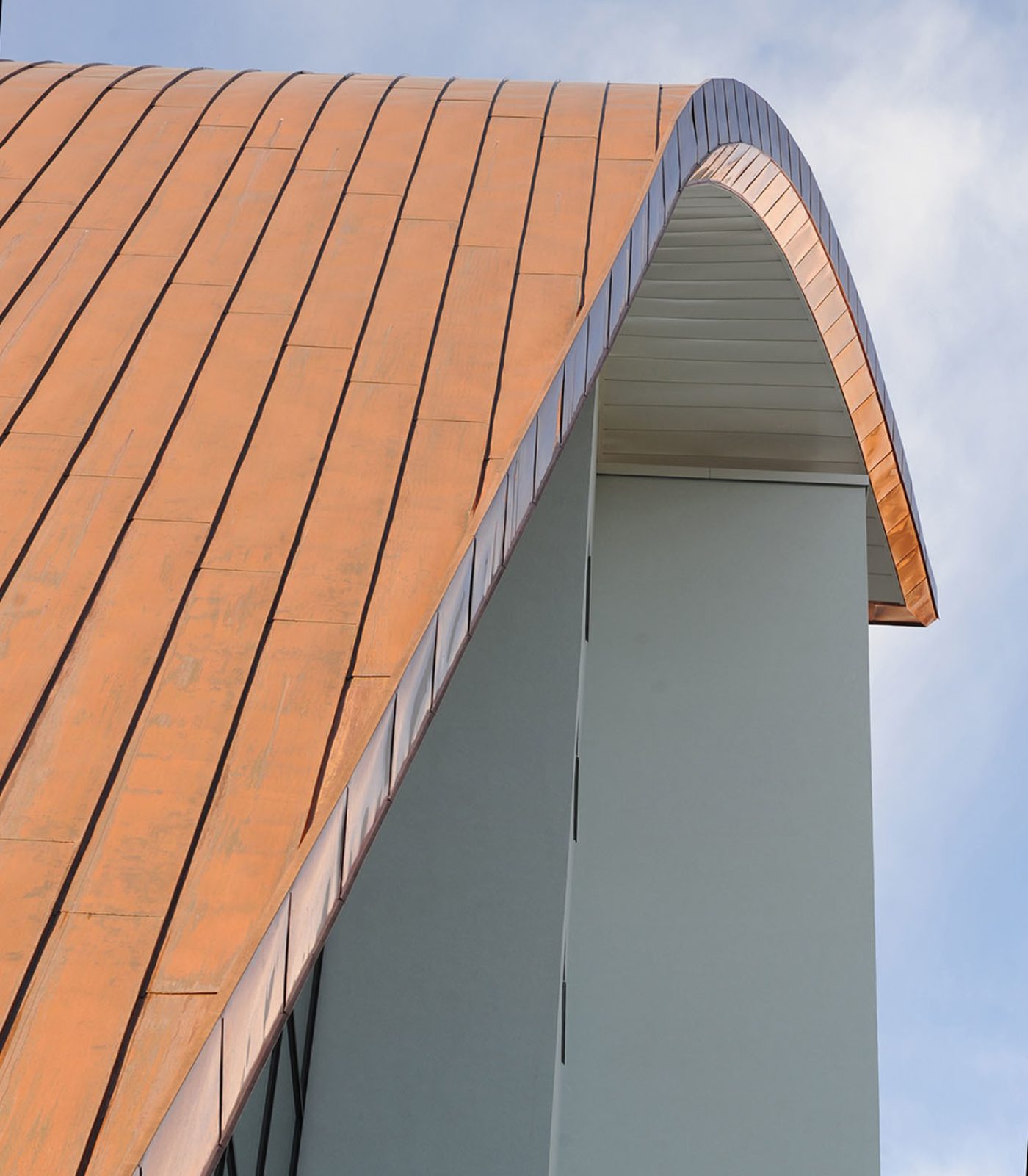 The dramatic building provides new student accommodation in 105 studio rooms as well as social, teaching and administrative spaces. In addition, the brief called for a striking building with an inviting interior that contains generous common rooms, a library and an interior garden.