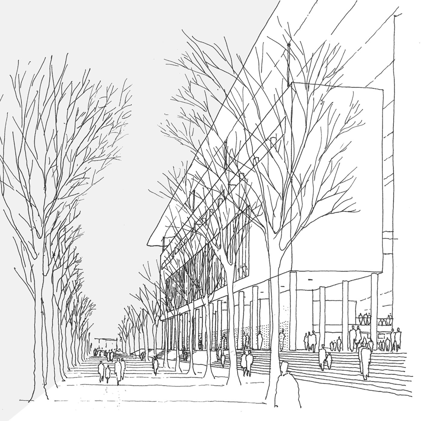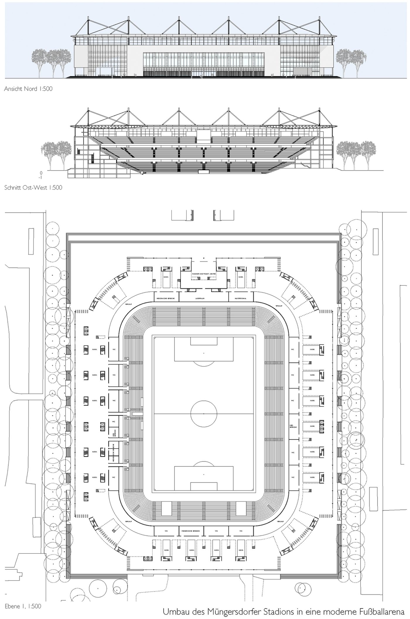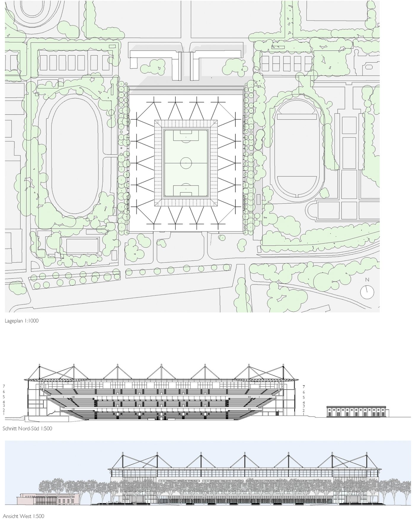 This competition design for a 45,000-seat football stadium for the 2006 World Cup included extensive changing, media and entertaining facilities as well as a health and fitness club. The stadium is situated in a large sports park within a forested area outside Cologne and is approached through the retained 1920’s gate to the park. The main entrance to the stadium forms a giant ''goal'' framing a glazed façade with an over-sailing suspended roof.