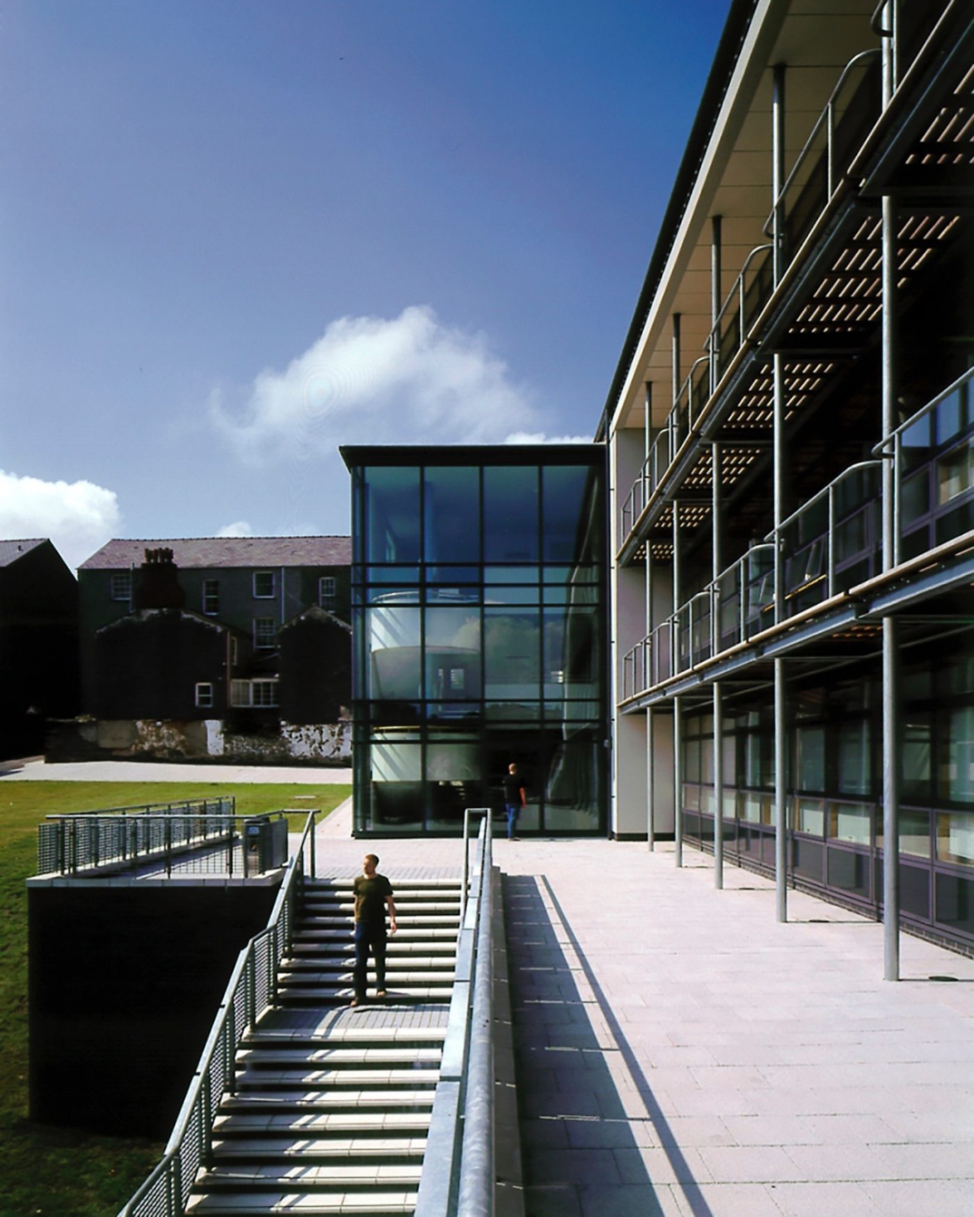 The project provides teaching and research space over three floors. for this flagship department. The second phase consisted of a second wing and the addition of a glass roof over the central space. The two phases of the building were planned to link to the older department buildings, and offer spectacular views of Snowdonia to all who work in the building. The building was conceived as a modern intervention incorporating materials appropriate to the local environment including white rendered walls and a Welsh slate roof.