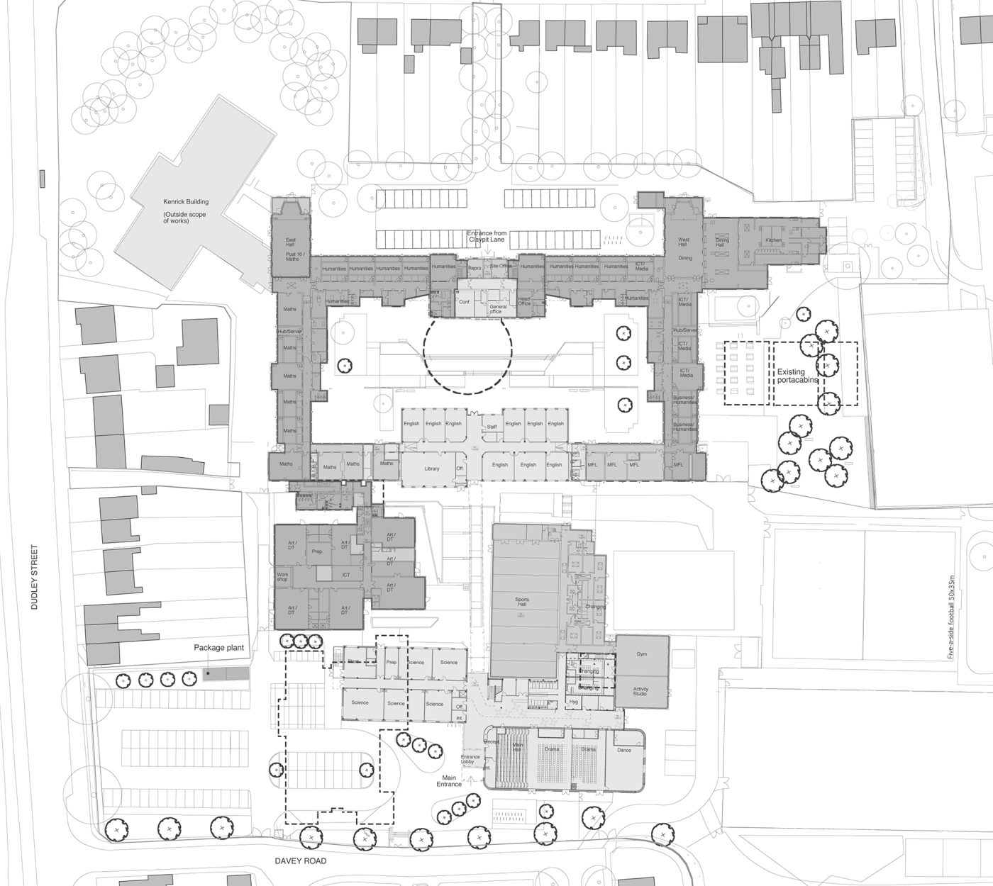 Key to the success of the project was the need to give the Academy a new identity and presence in the Public Realm. The narrow 1932 entrance was set back from Claypit Lane resulting in the entrance not having a public presence. The new front entrance onto Davey Road is generous allowing the whole community into the Academy.