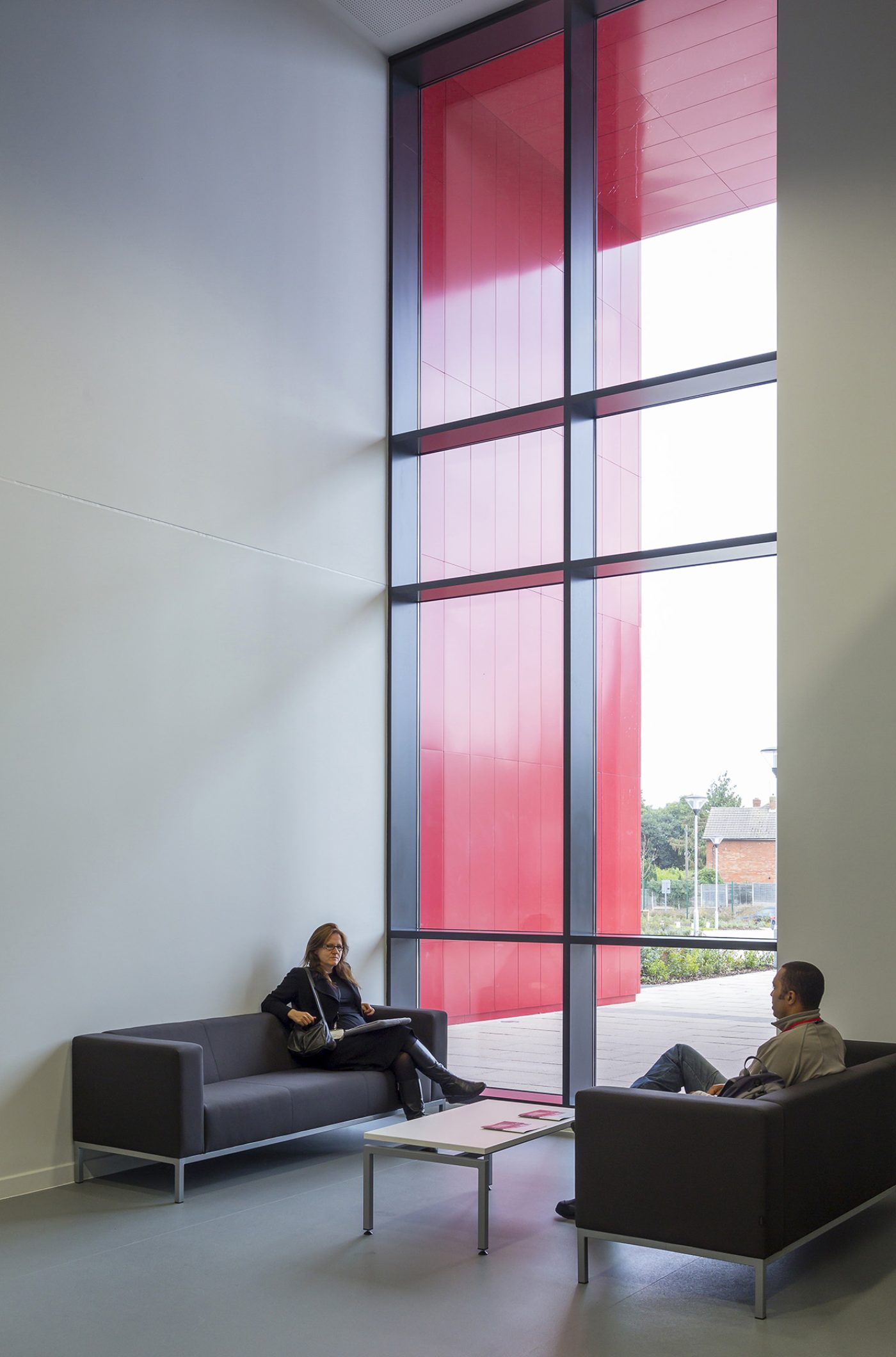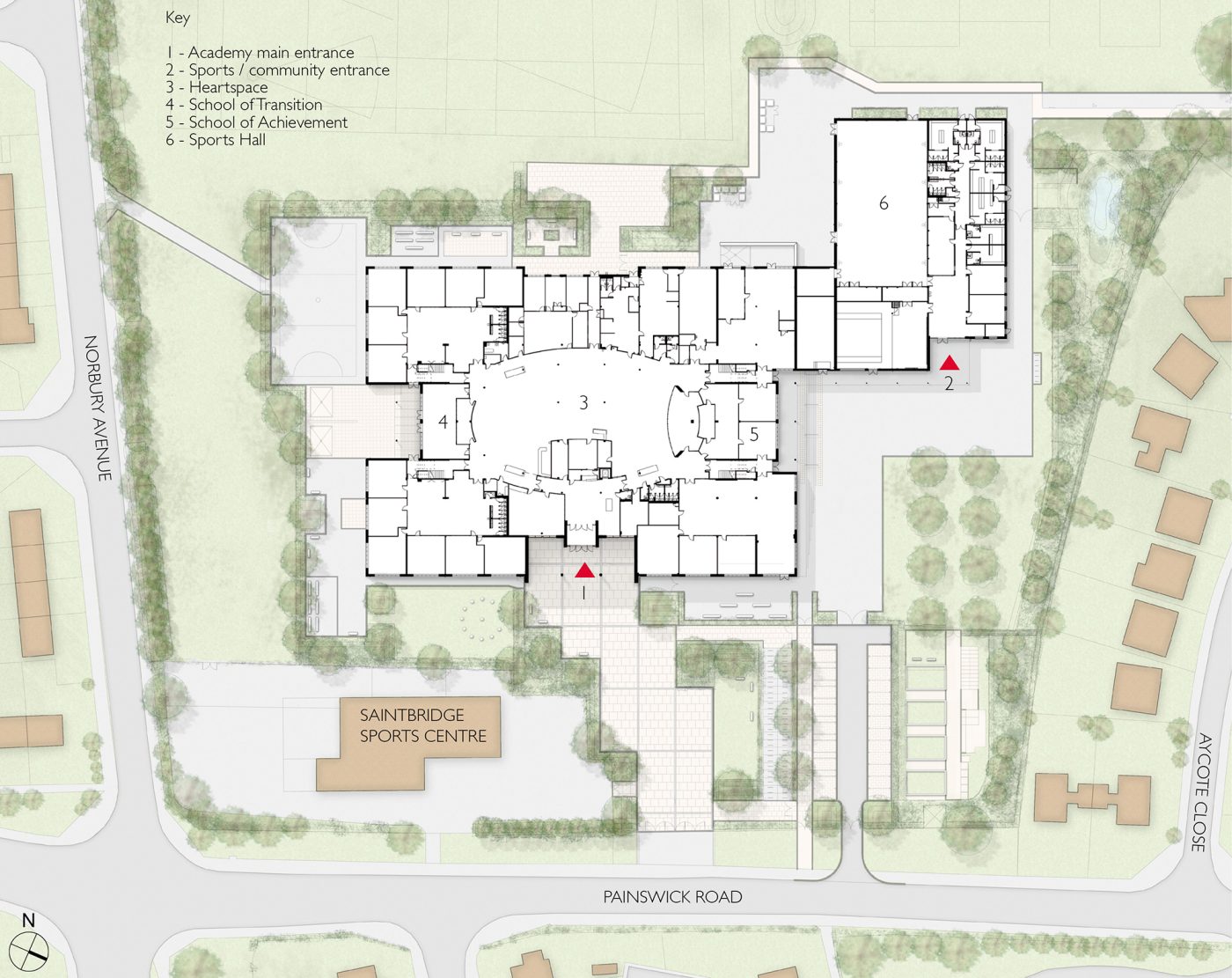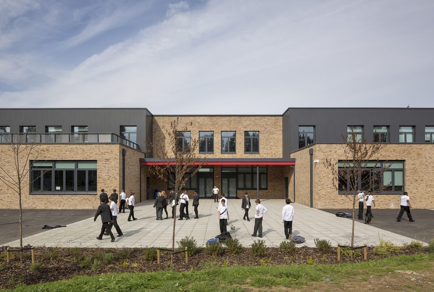 The entrance is framed with a red arched canopy, giving civic presence and a clear identity, welcoming students and the community to the new facility. The building has been designed as a compact form arranged over two storeys. Learning clusters are positioned around an ellipsoidal heart-space. A bridge at first floor level creates a more intimate touchdown space at the interface between the School of Transition on one side and the School of Achievement on the other.