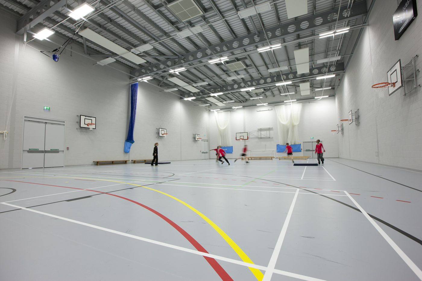 The sports facility is a separate building linked to the Academy which maximises those facilities usable by the community, with an emphasis on a sports hall and gym with direct access to the pitches and performance areas for dance or drama.