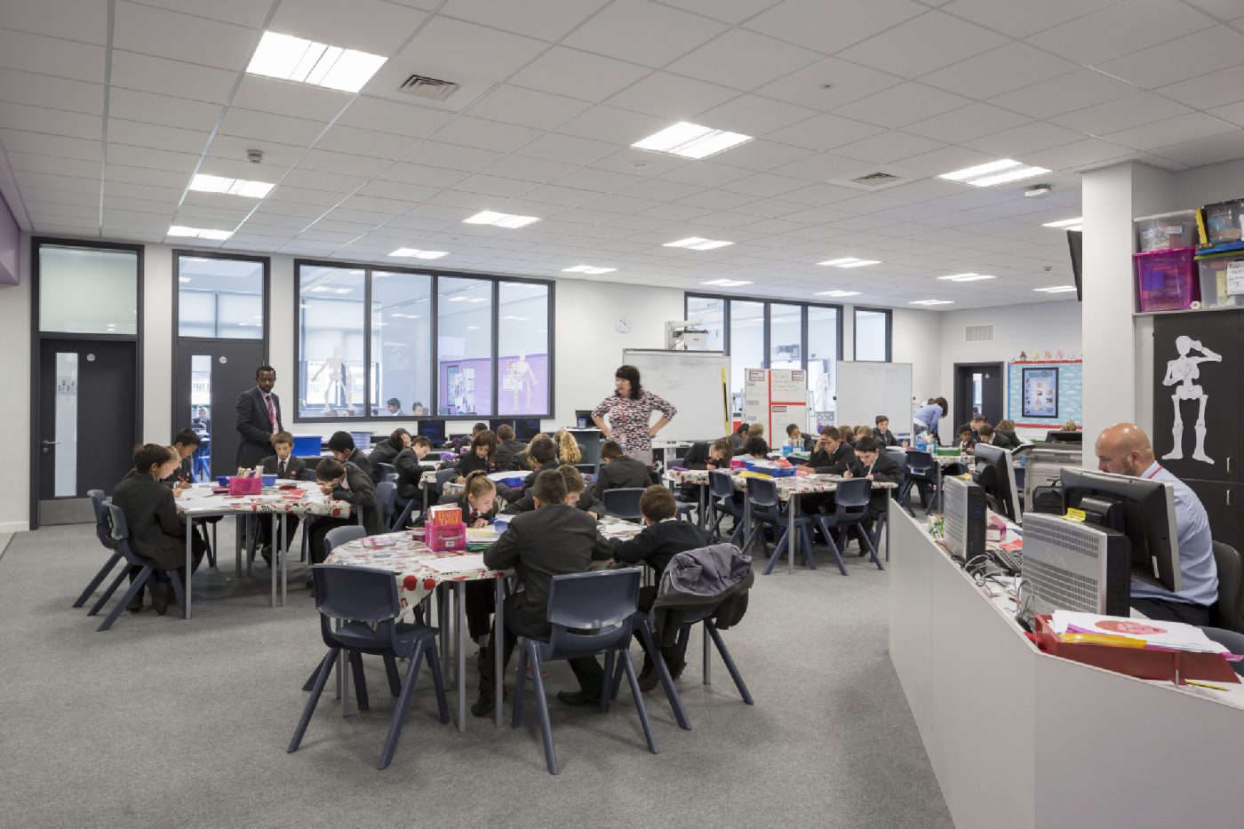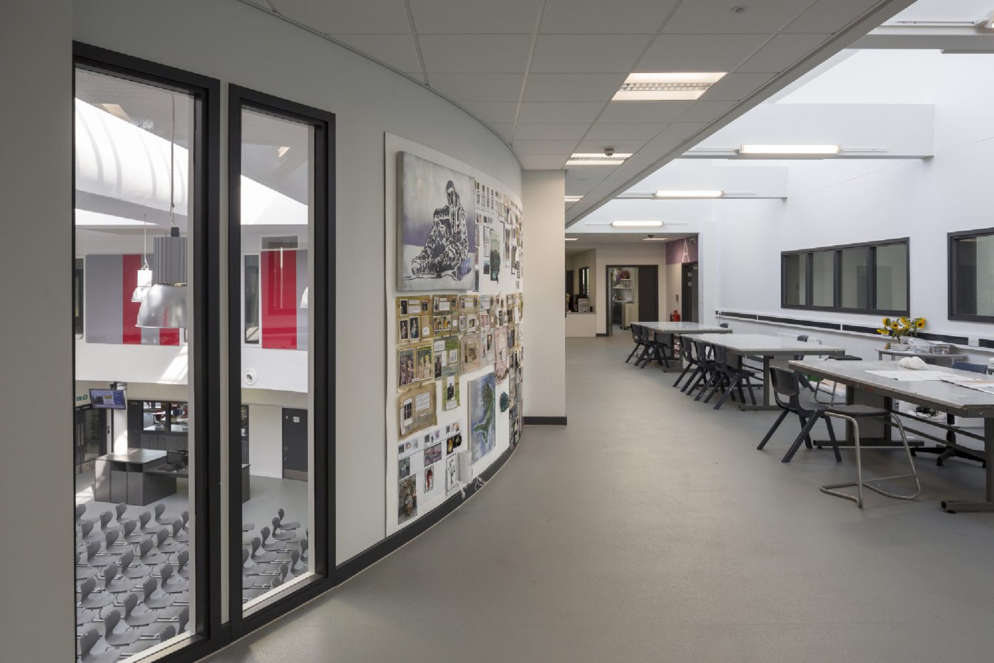 The central heart space is a focussed and multifunctional area, rich in access to ICT, with hands-on access to a variety of learning settings. It provides flexible dining areas and a place for social use on bad weather days or for events, exhibition and displays. It can be used for assemblies, lead lessons for multiple groups and for lectures or talks. It also offers a less formal interface for staff and students to meet and talk and further develop good relationships. The Academy’s specialism of digital technology is a ubiquitous feature supporting all learning, teaching and administration.