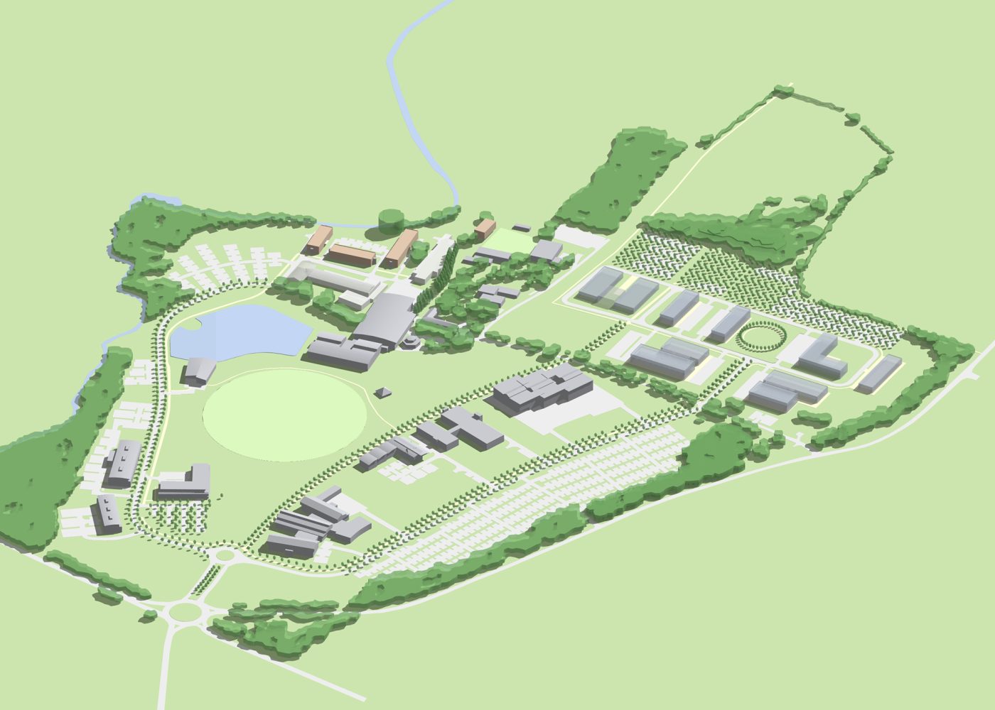 The essential characteristics of the masterplan are a re-contoured ground form, structural landscaping, a layout of roads, pathway and parking zones and a set of rules governing the new buildings on site.