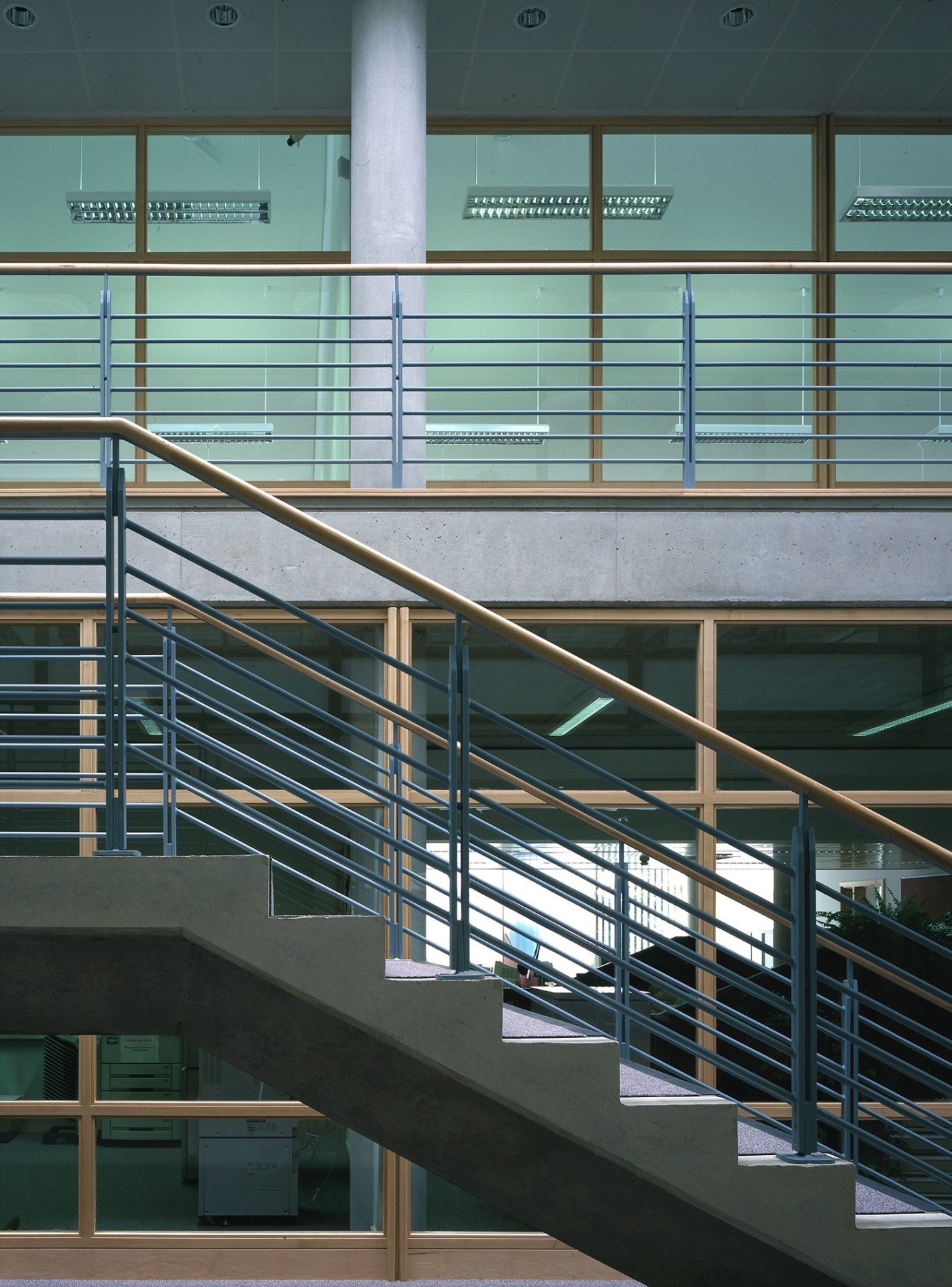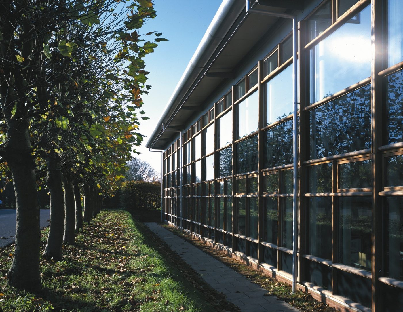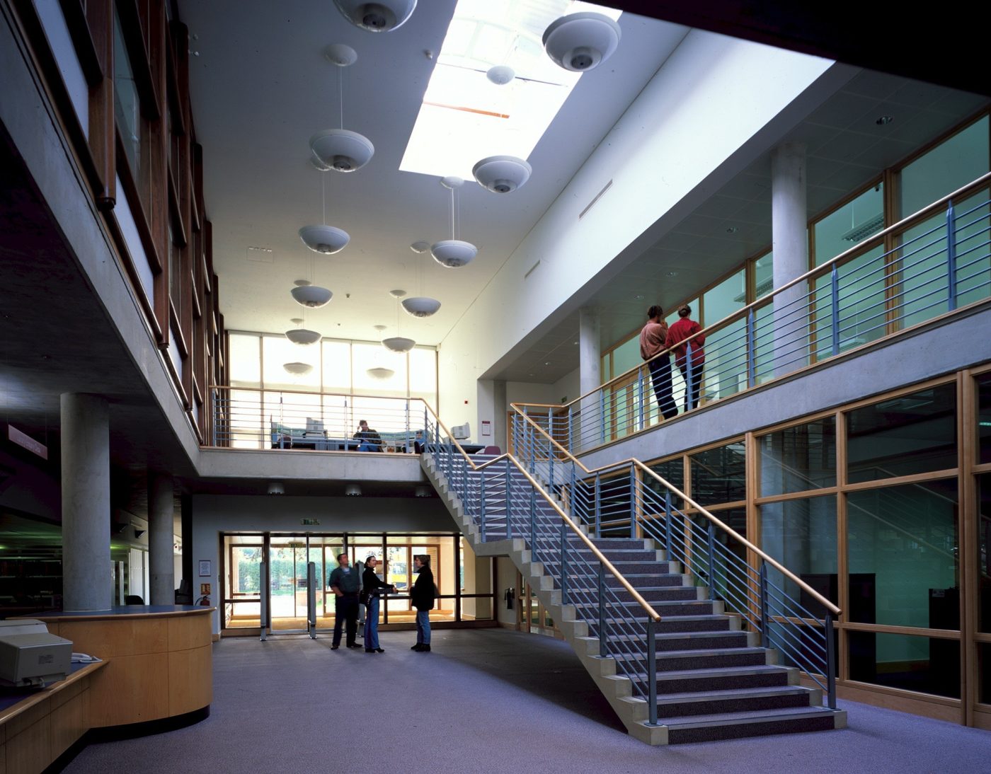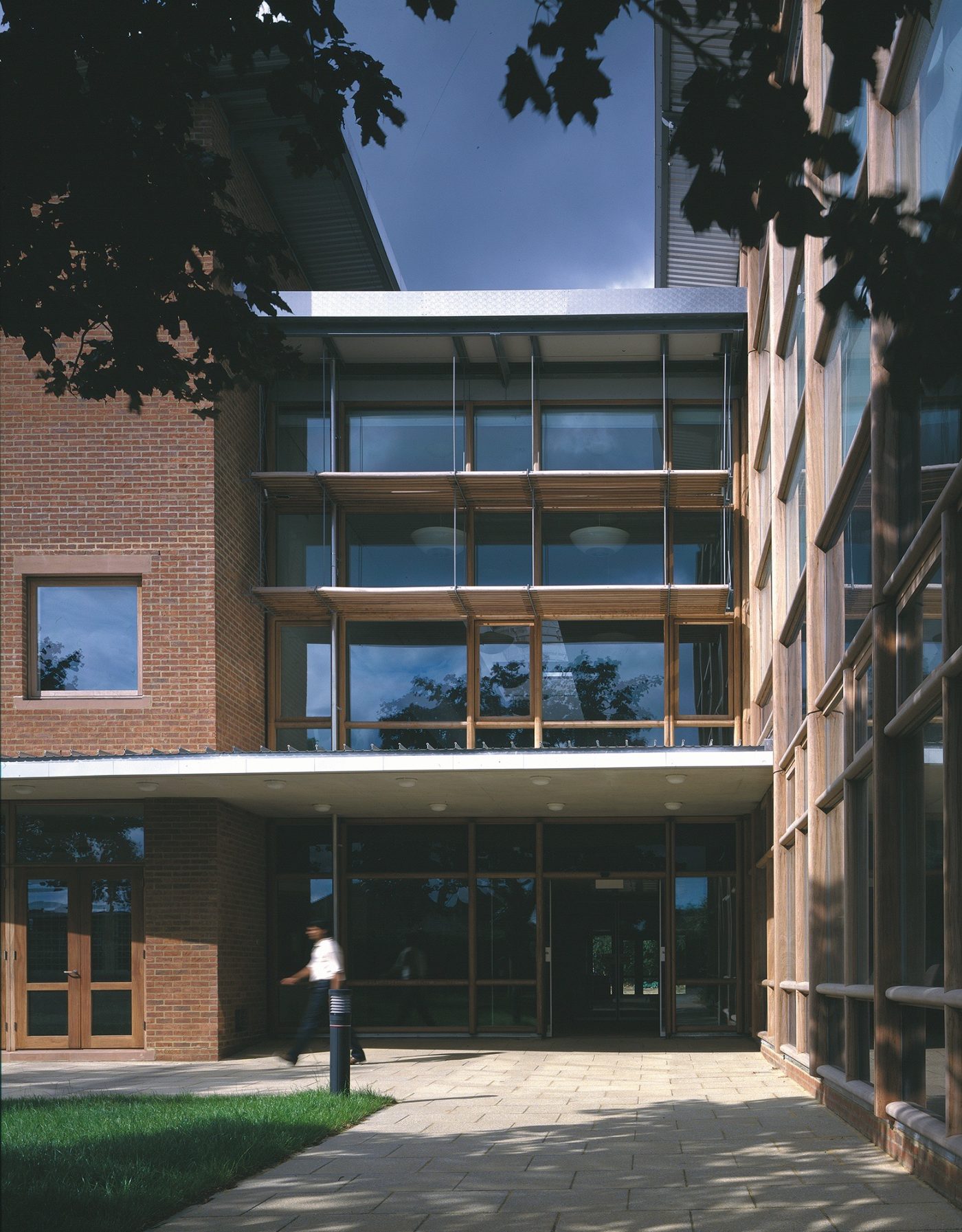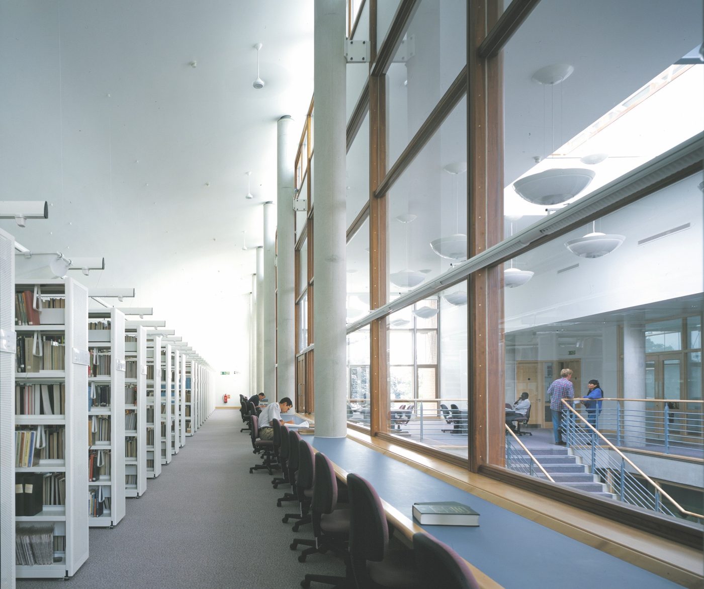 The building was constructed with its long east and west faces between two existing rows of pleached trees. The trees help to protect the building from low sunshine in the summer months. The main library hall is naturally lit, with clerestory lighting falling between the bookstacks.