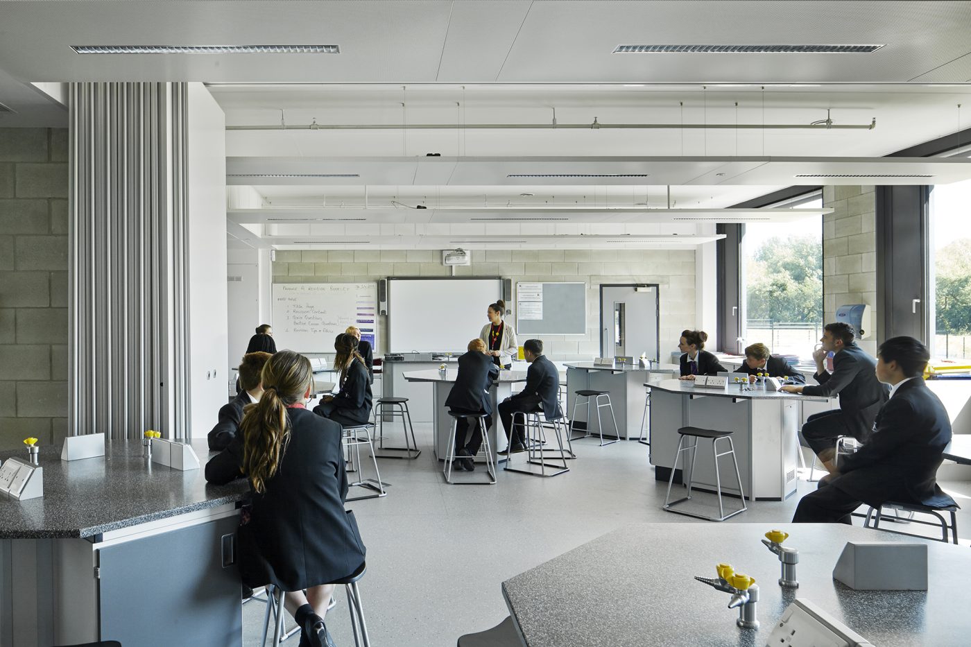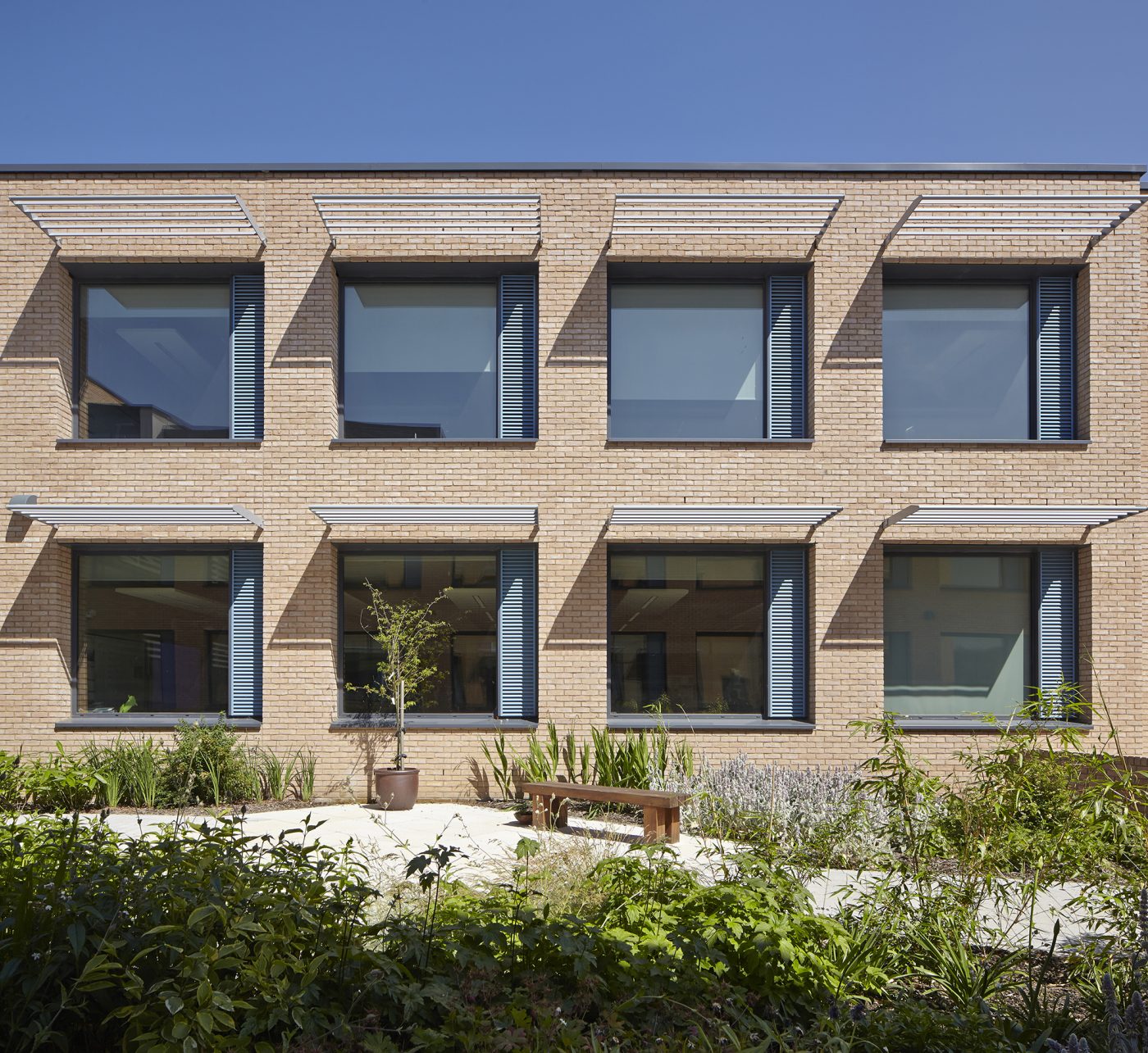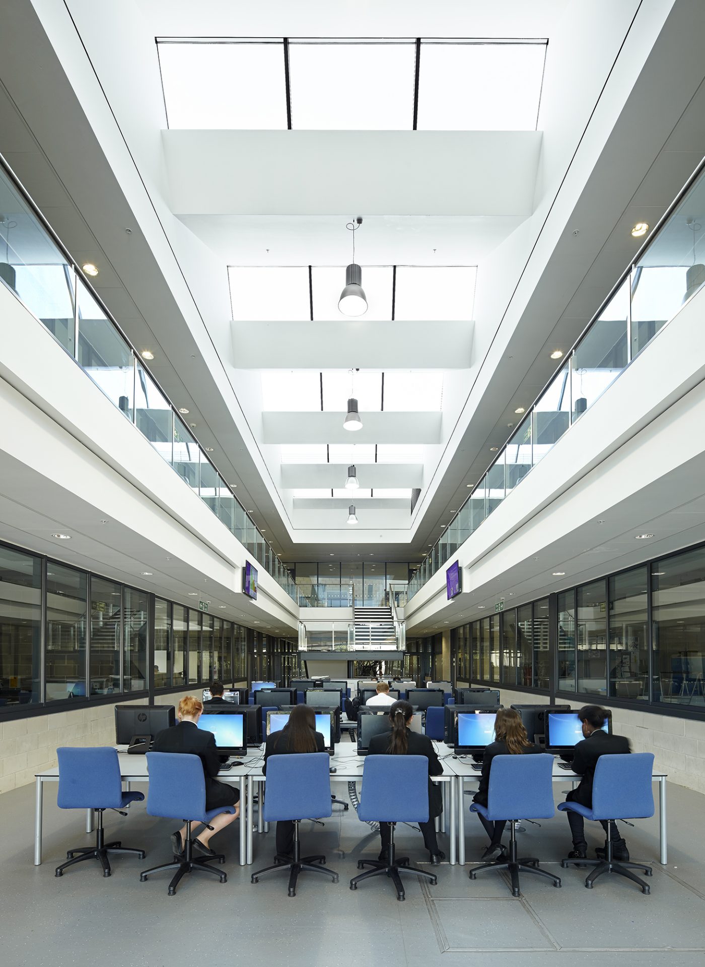 Each teaching wing comprises a generous, double-height open learning area, lit from above by north-facing rooflights. Fully-glazed classroom walls flank this space on either side.
