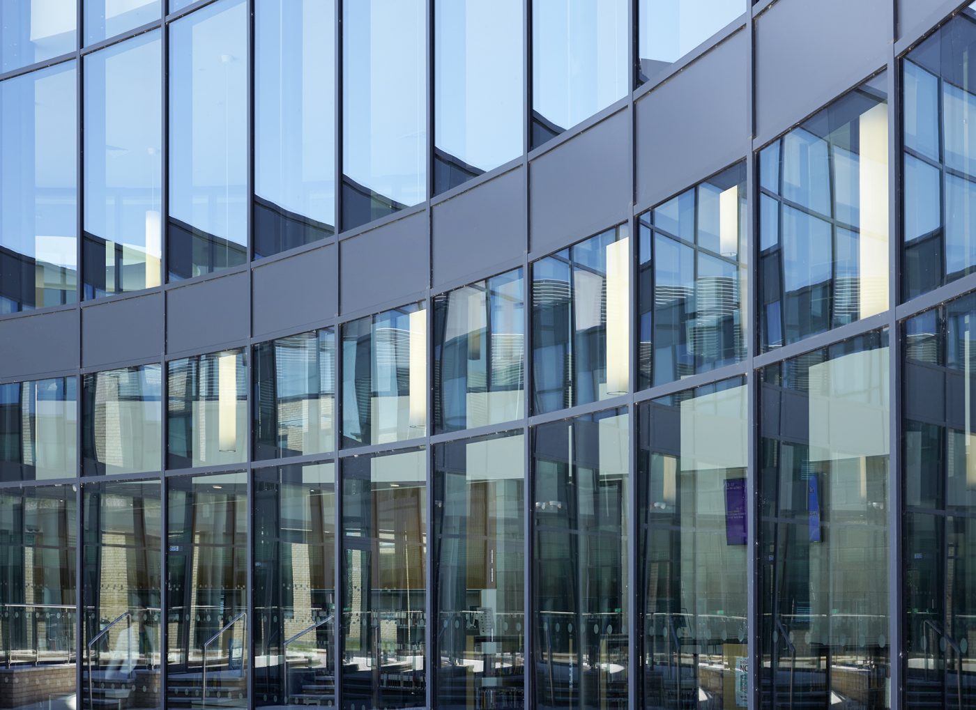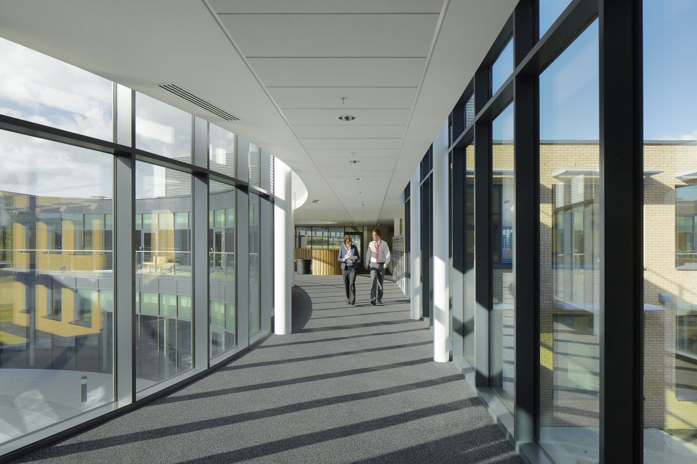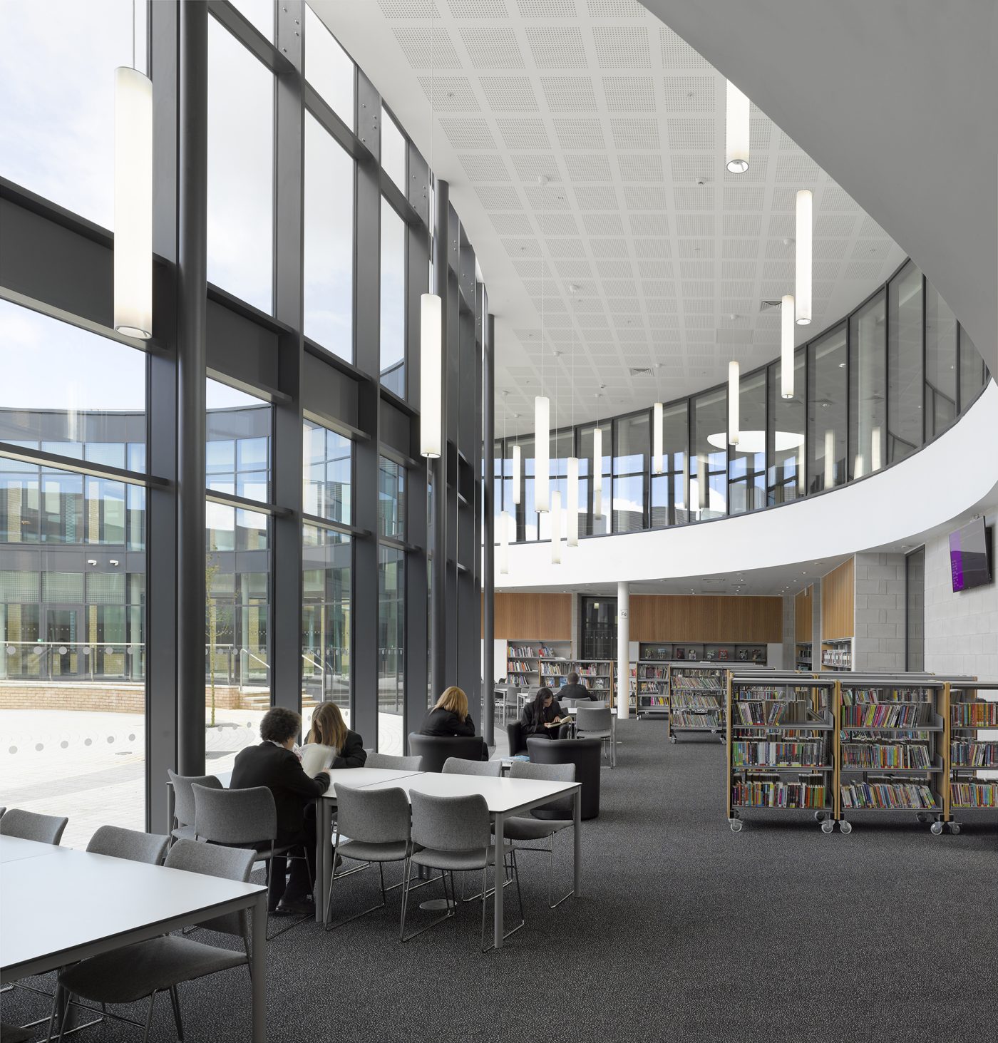 Each teaching wing comprises a generous, double-height open learning area, lit from above by north-facing rooflights. Fully-glazed classroom walls flank this space on either side.