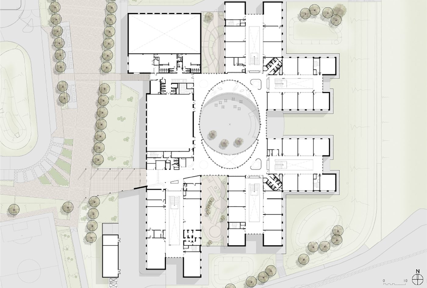 The design strongly reflects the philosophy of its sponsor, the Brooke Weston Trust, reinforcing the trust's tenets of community, equality and mutual respect. The main entrance, under an imposing canopy, is at the academy's upper floor level. Two-storey teaching wings are arranged around a large circular courtyard, which is overlaid with a secondary elliptical geometry, forming the focus for the library, restaurant, theatre and main circulation routes.