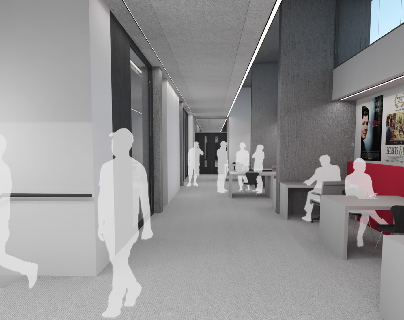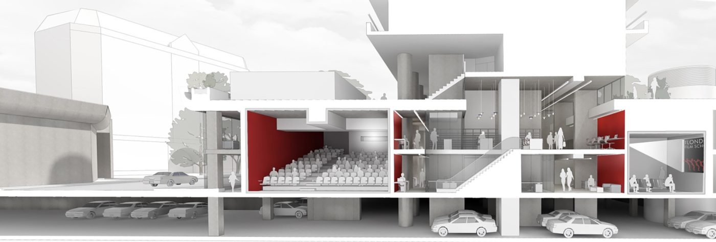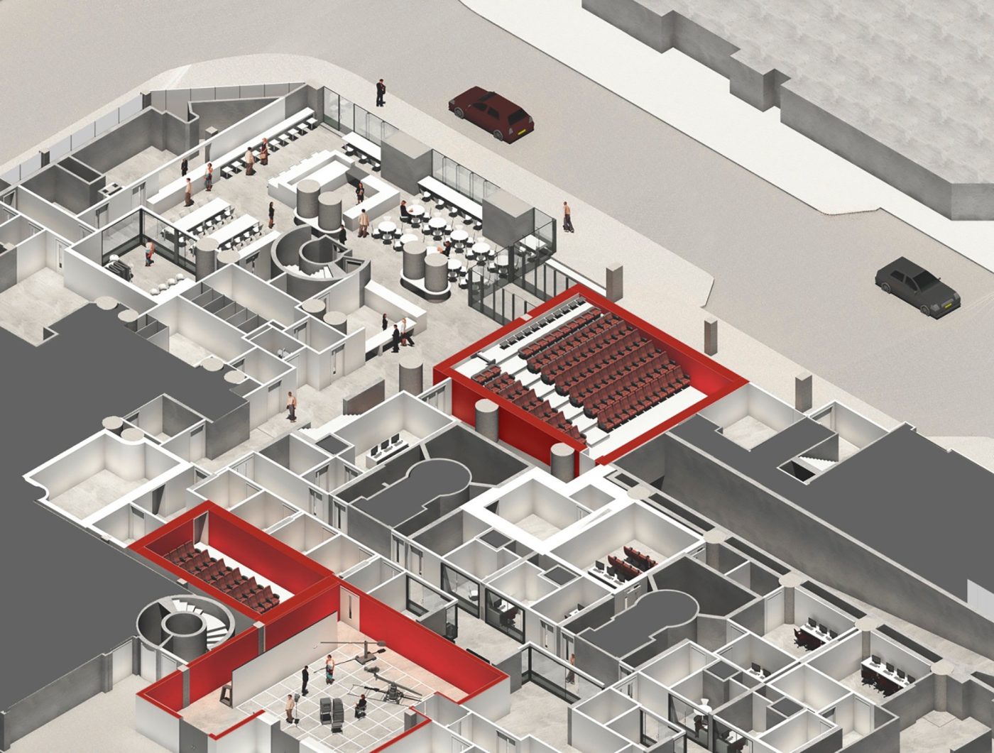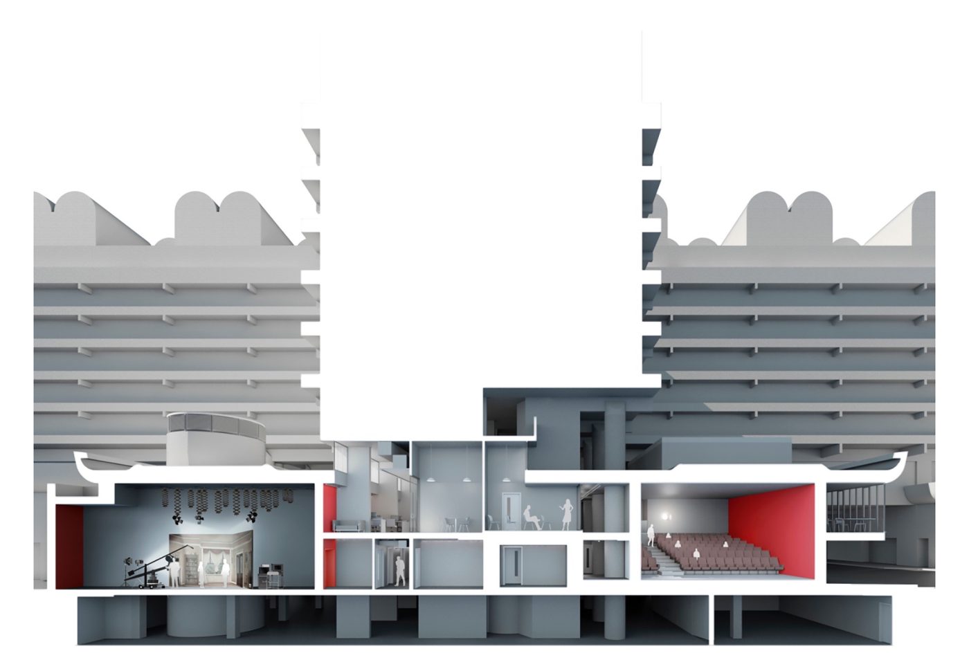 The initial design to re-locate the London Film School to the Barbican gained planning and listed building consent, but unfortunately the project was halted. The new facilities were to join a cultural hub of existing art institutions, notably the Barbican Arts Centre, the Barbican cinemas and the Guildhall School of Music and Drama. The design provided new cinemas, shooting stages, editing suites, post production facilities as well as a new welcoming entrance, café space, teaching and office accommodation within the confines of two levels of the remainder of the unused Exhibition Hall 1.
