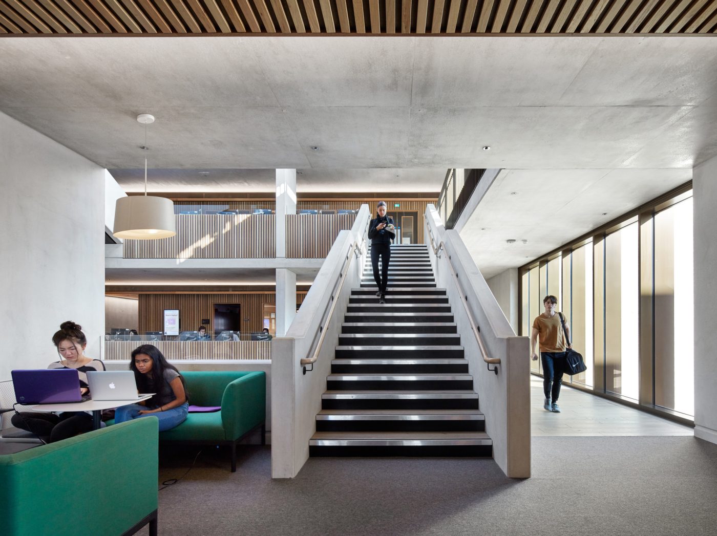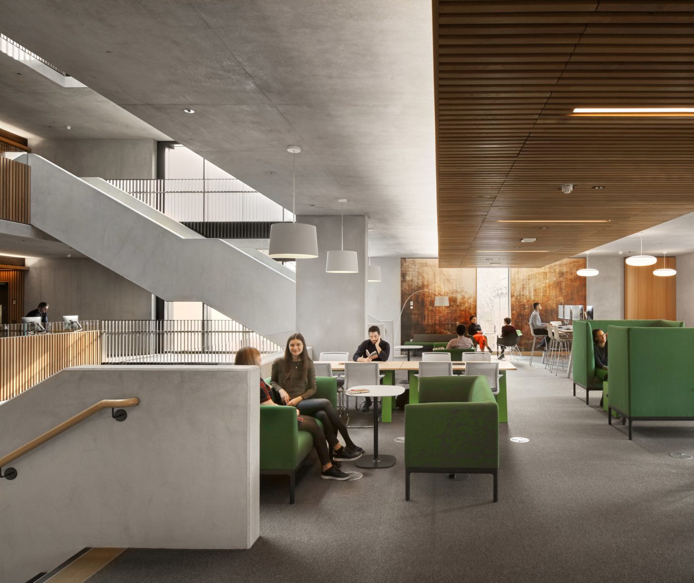 A rich variety of learning and work environments has been provided. The spaces vary in character and size, creating different types of individual study and group collaboration settings, as well as more social learning areas. Spaces and furniture solutions have been designed to be flexible and adaptable to suit changing needs. All are IT resourced, with effective power provision.