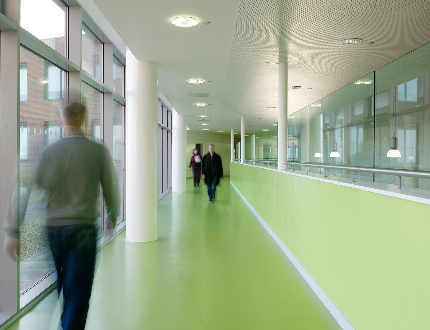 Circulation has been planned to avoid long dark disorientating routes. The large double height entrance and café form part of the route around the school and help minimise the extent of corridors. Where these do exist, windows offer views out and some are opened up into daylight-filled harbours or 'faculty open areas' which can be used for breakout teaching or social gathering. Colour has been used to aid wayfinding as well as to enliven space.