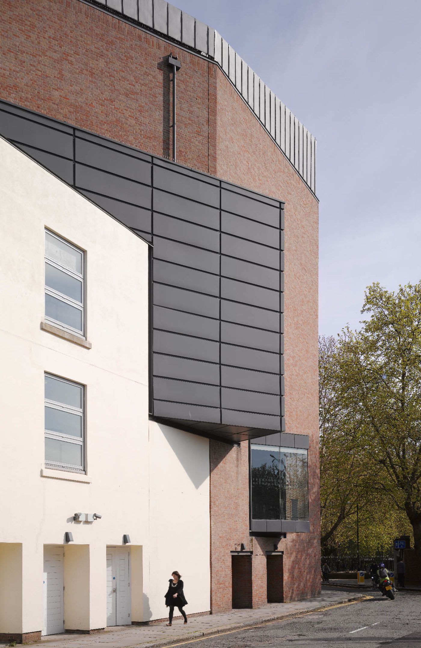 The building envelope focuses on the relationship of the new foyer spaces to the reconstructed auditorium and stage which remain in their original locations. The perimeter walls are treated as simple planes, occasionally broken to reveal the projecting volumes of the meeting rooms and the fly tower.