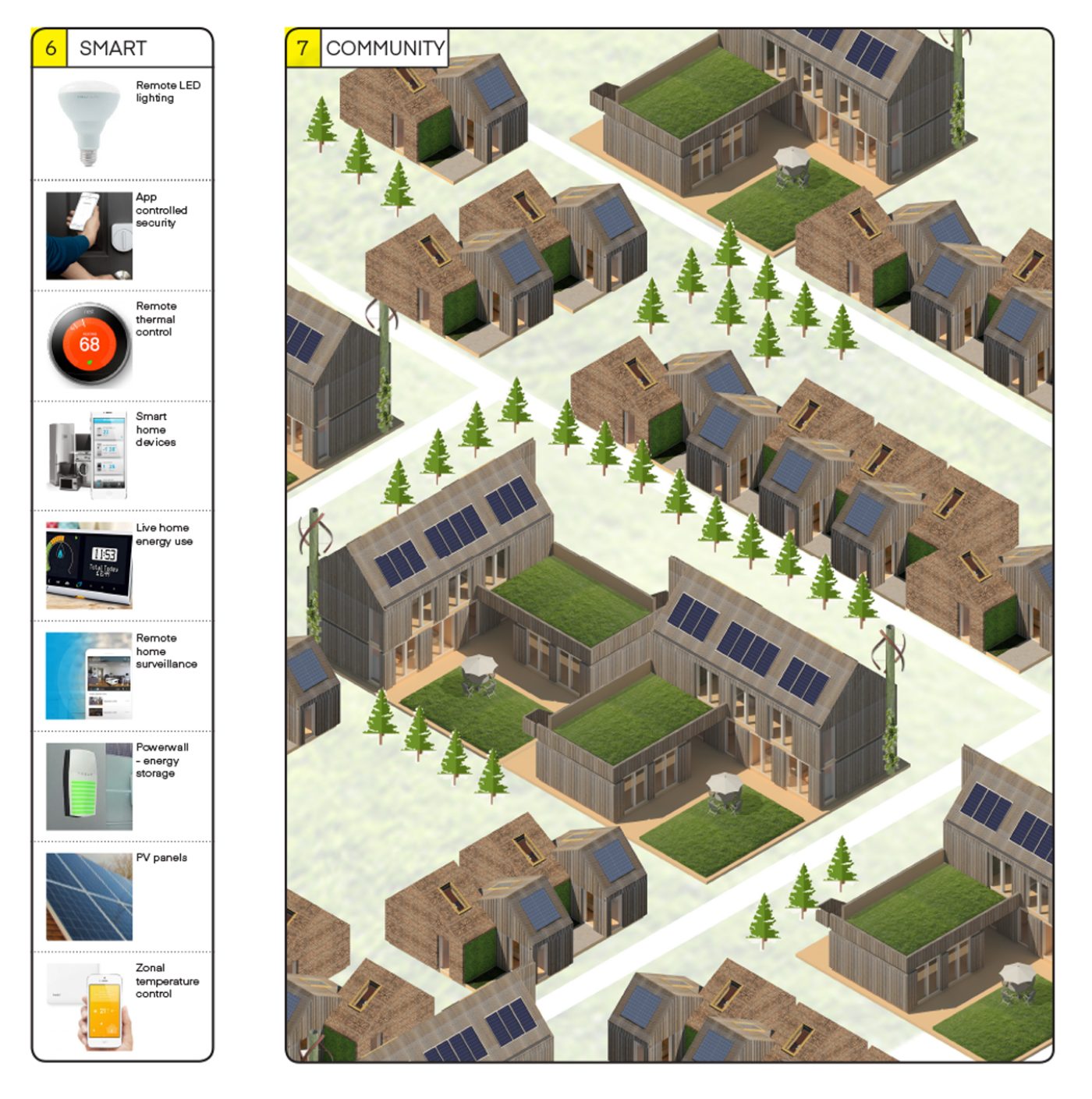 Smart Metering is installed for utilities and life functions; Water usage, electricity usage, electricity production from PVs and turbines, air quality, CO2 levels, sleeping environment, movement.