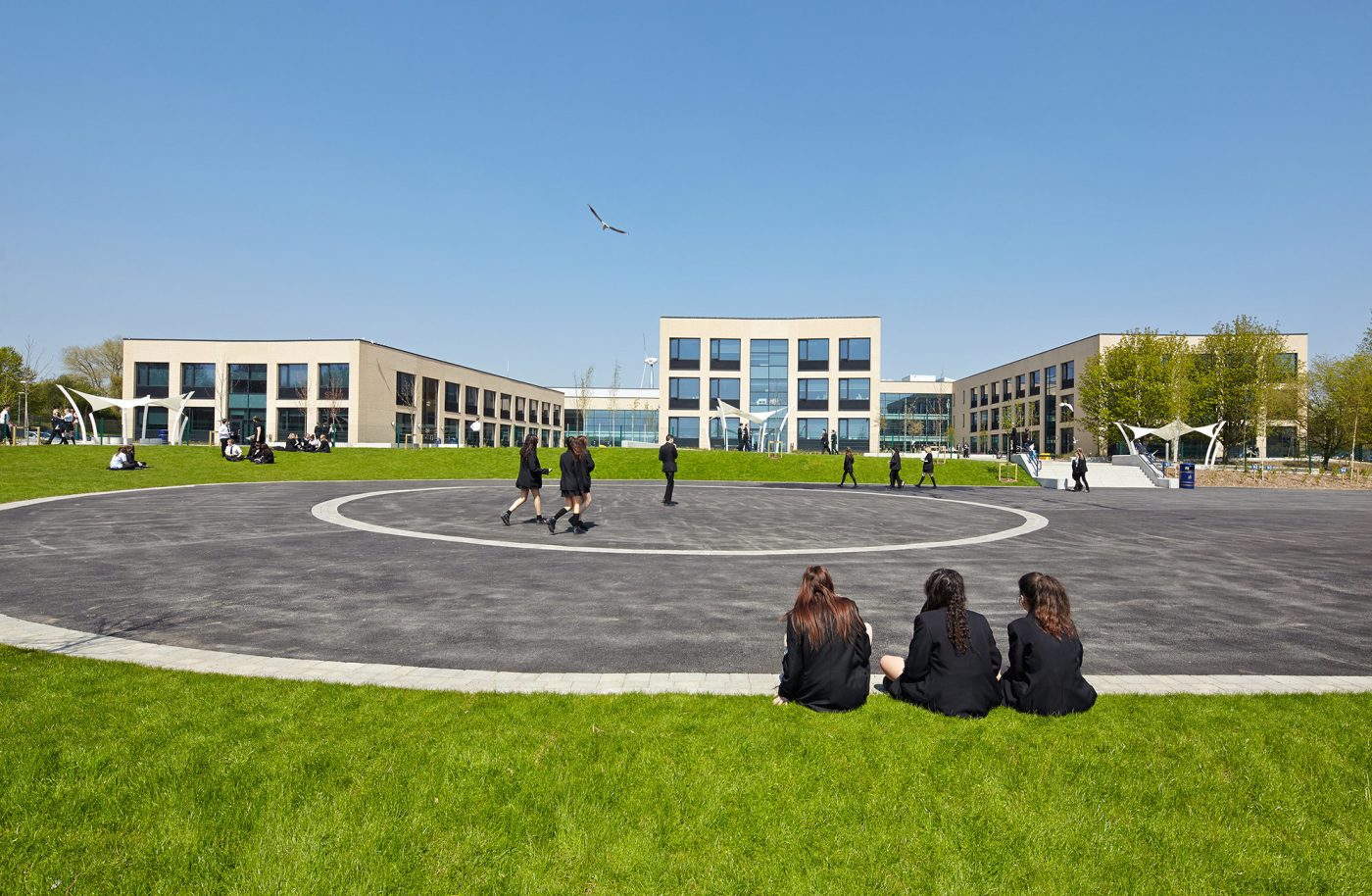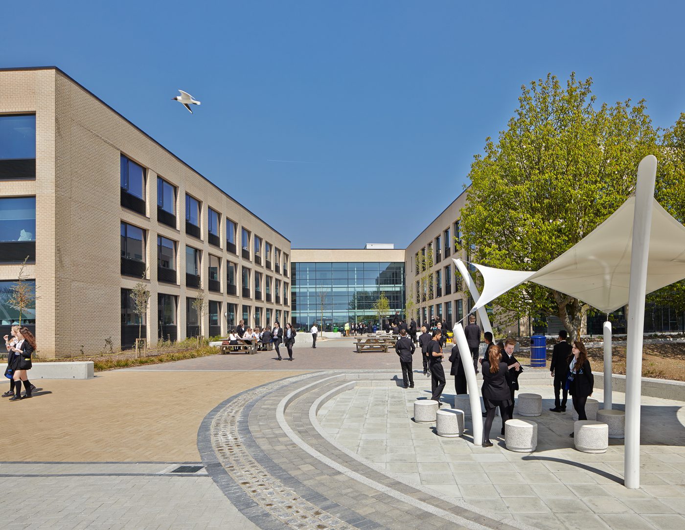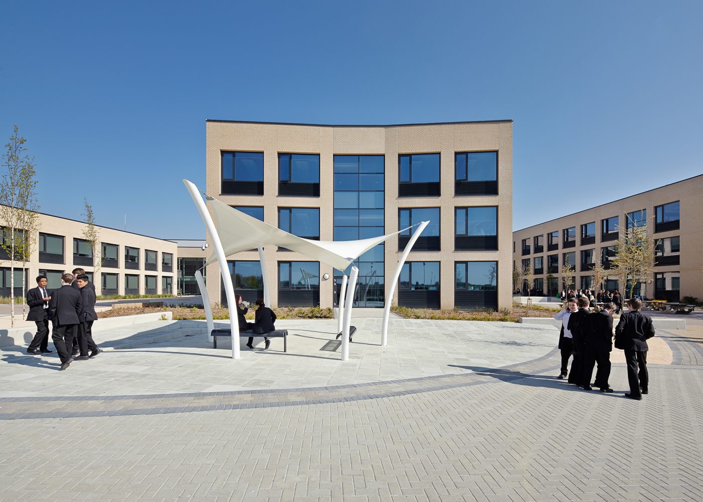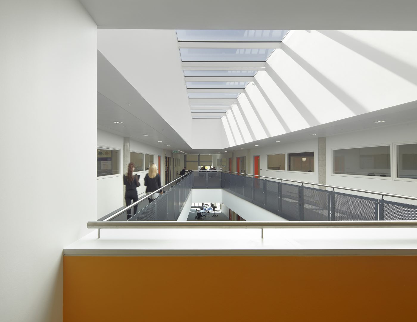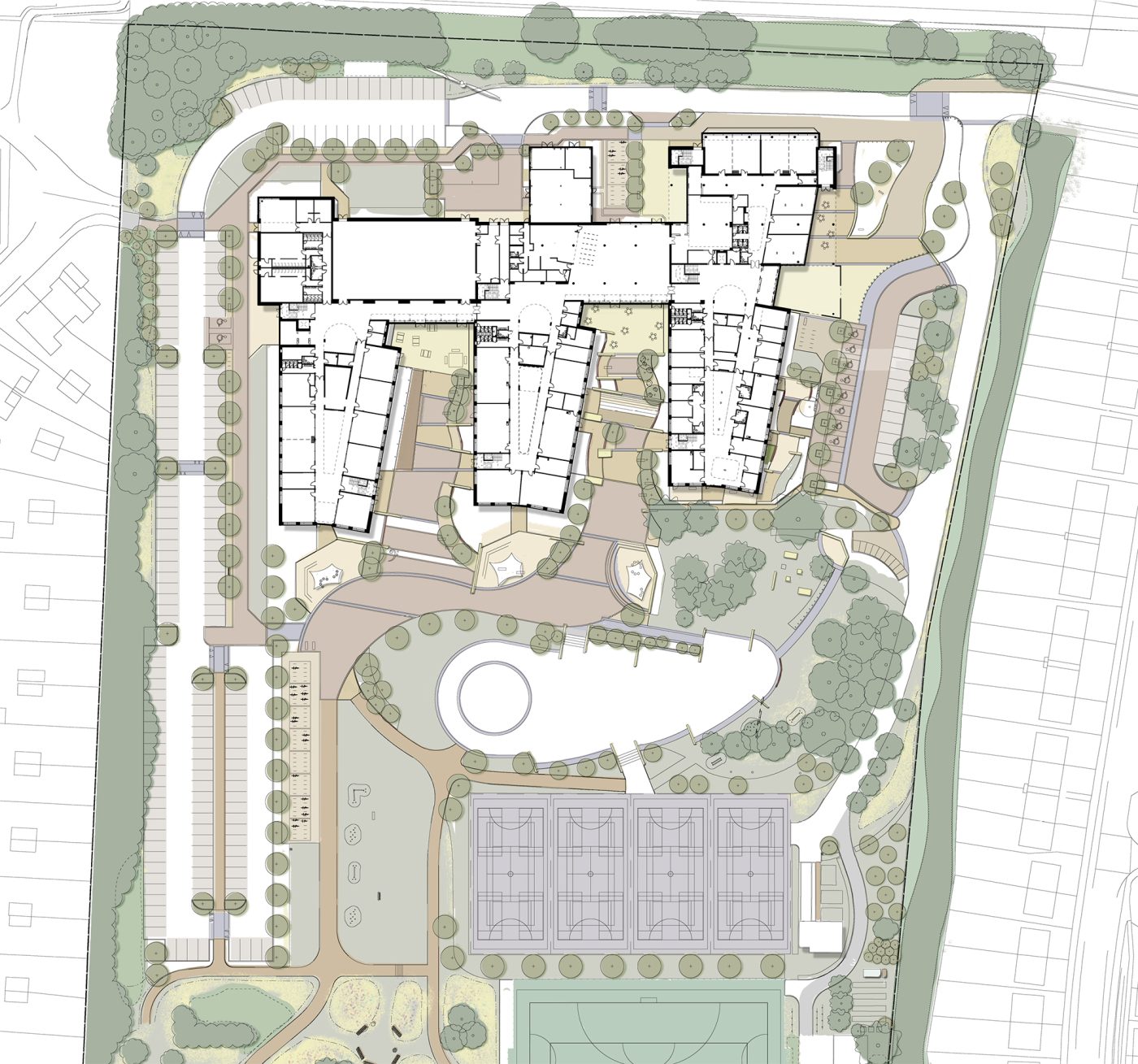 The site slopes southwards away from the busy A2 main road and the building has an E-shaped plan, placing its larger volumes on the north side to buffer the road noise. Three teaching wings extend southwards from the main spine and define open courtyards overlooking the playing fields.