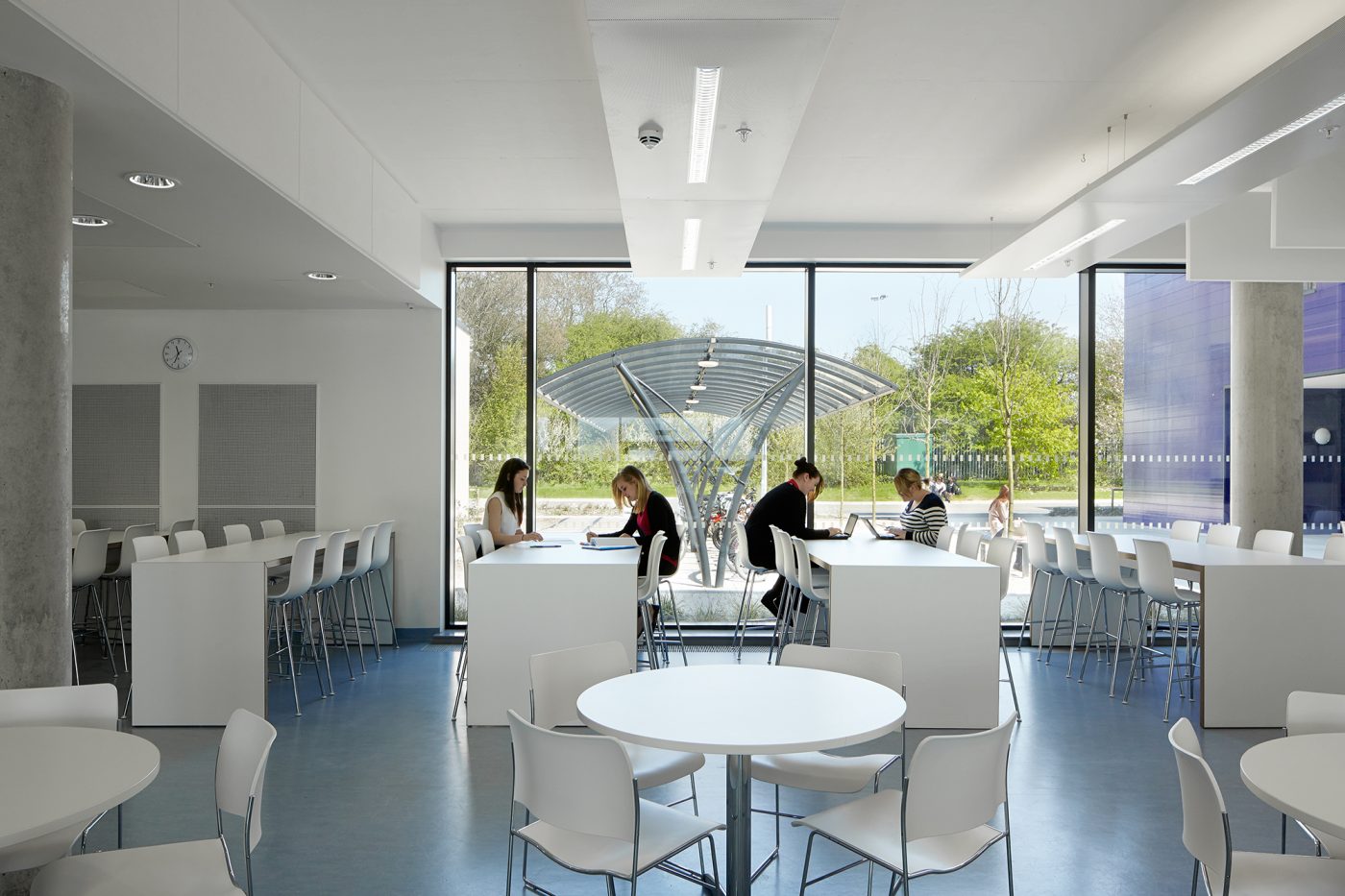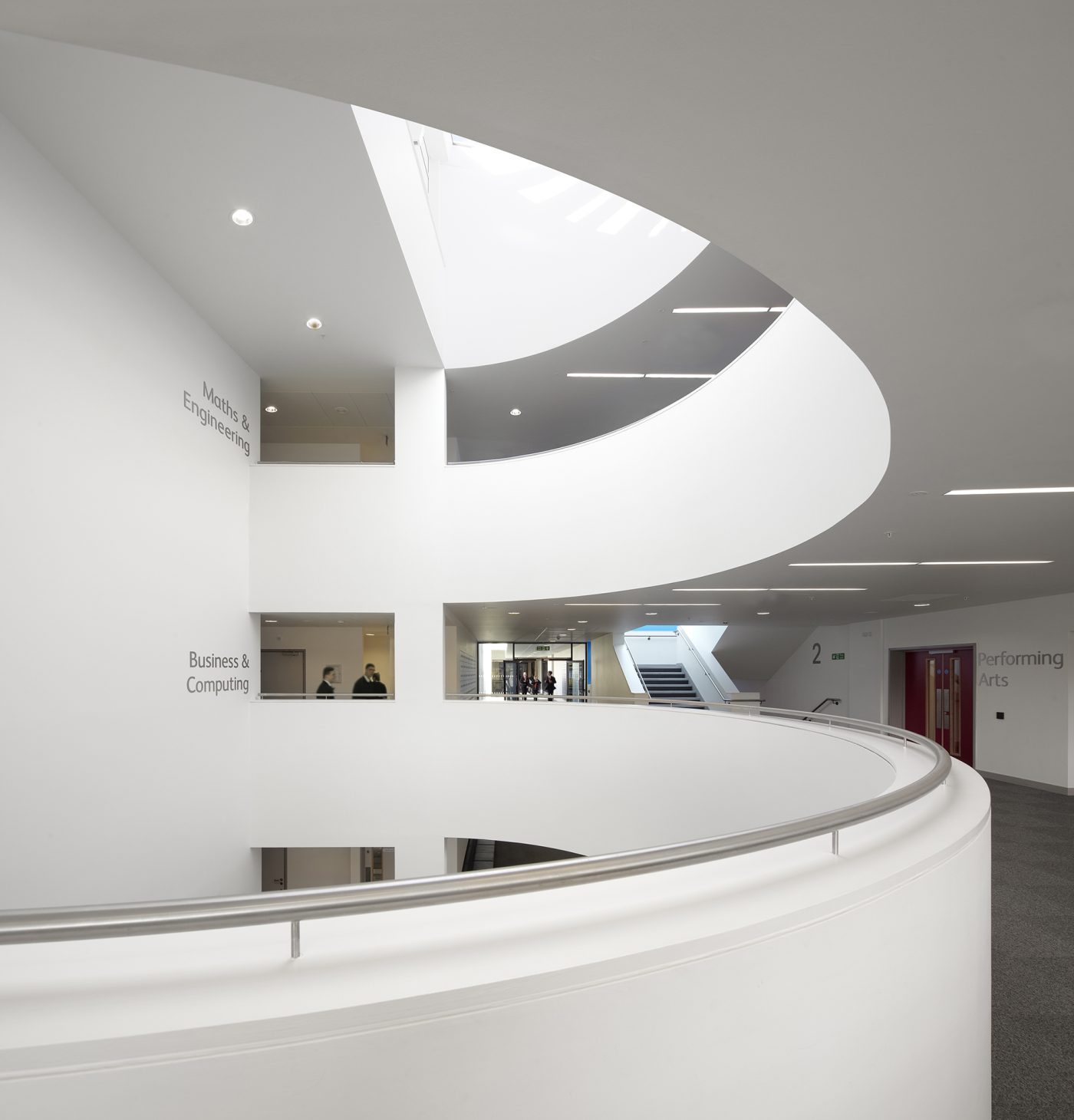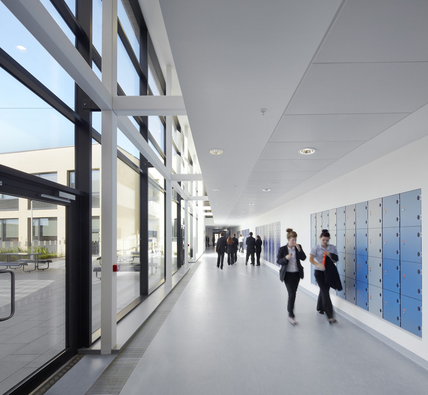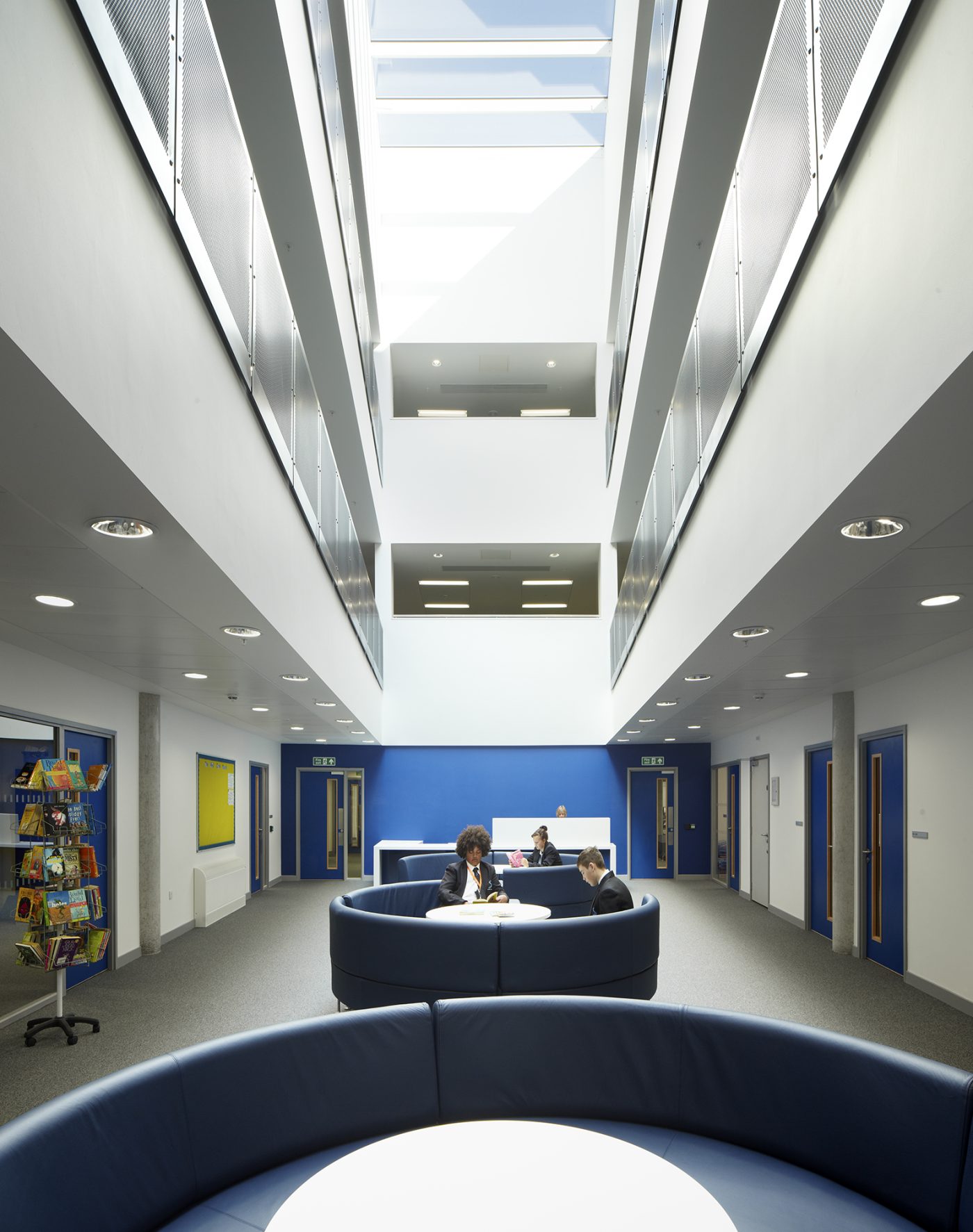 An orderly language of pale, textured brickwork reflects the 'grown-up' aspirations of the academy. Blue-glazed terracotta tiles clad the main hall at the ‘head’ of the building. Elsewhere, daylight and transparency characterise the interior.
