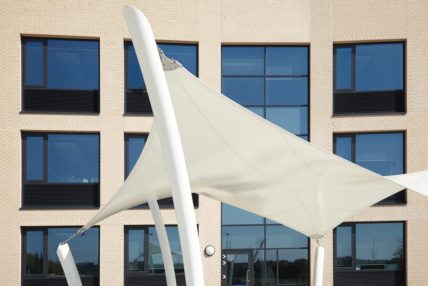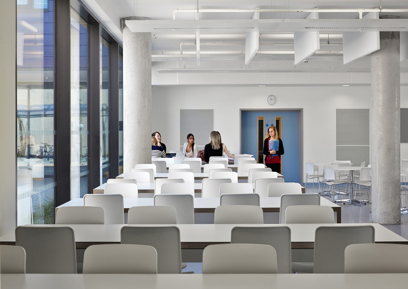 The learning spaces are grouped in clusters in each of the three wings. On each floor, the classrooms are arranged around a tapered atrium, with an open shared workspace at one end. The classrooms have generous dimensions and large internal and external windows, so that the overall transparency within the cluster reinforces its sense of identity and makes orientation easy. It also contributes to orderly behavior.