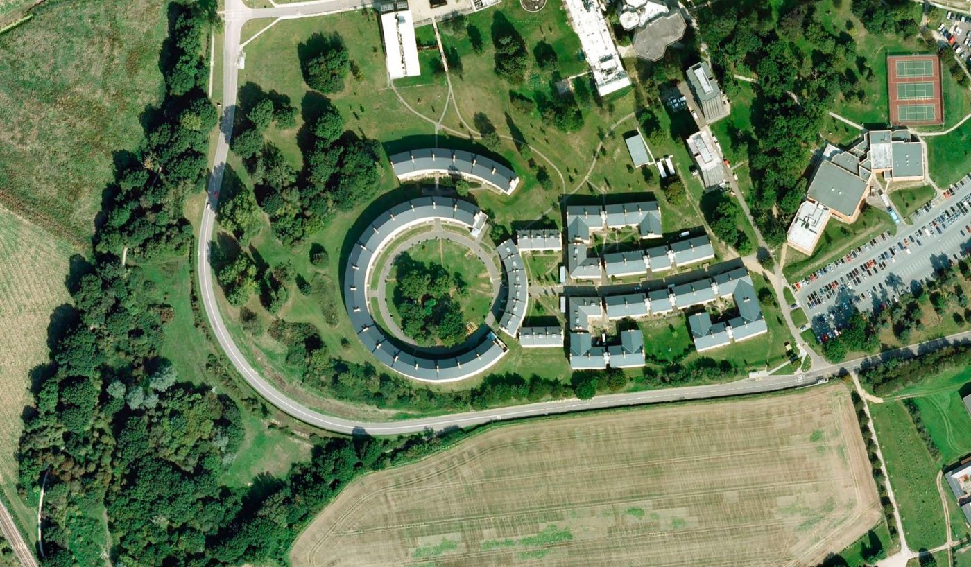 The design consists of five interconnecting courts of which three are fully enclosed and two are open to the landscape. The tree-lined central route culminates in a large oval space formed by crescents surrounding mature oak trees.