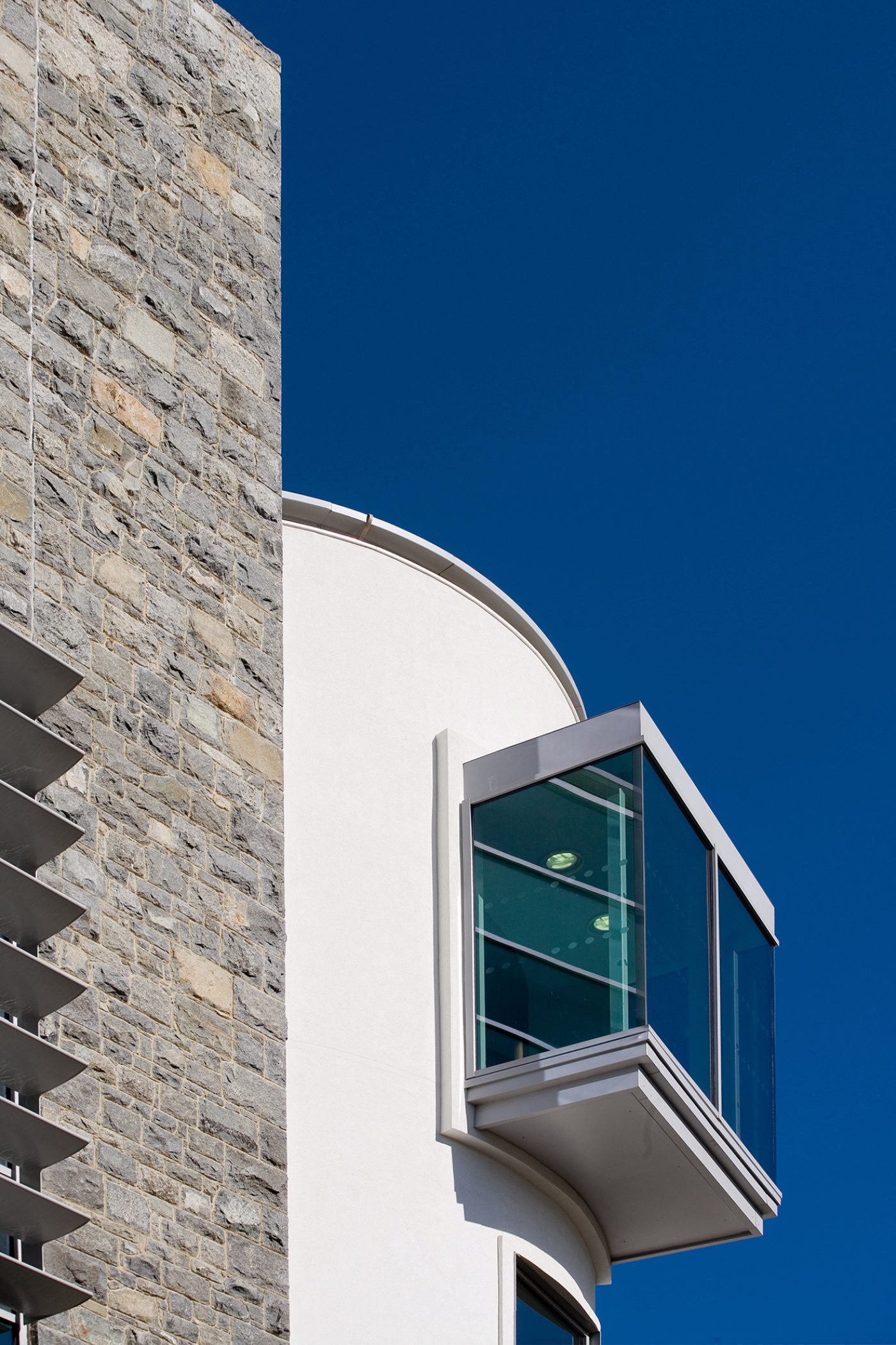 A massive granite wall wraps around most of the perimeter of the court building. This is punctured by windows – sometimes within the depth of the wall, sometimes protruding from it. The wall reflects the vernacular tradition of granite building on the island and uses salvaged stone from the prison buildings that previously occupied the site.