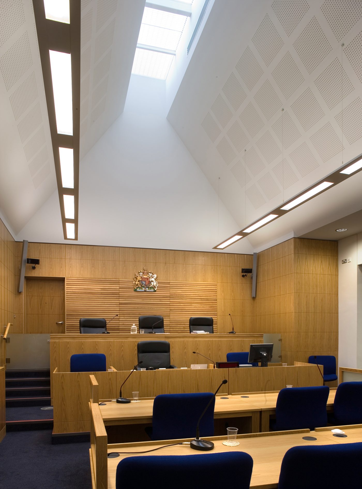 Located in the centre of historic St Peter Port, on a tight and steeply sloping site, the new building houses a criminal court and magistrates court as well as public, custodial and administrative functions. It is linked to the original Royal Court Building of 1800, which forms the seat of government as well as justice. The two buildings together form a single, flexible and secure complex.