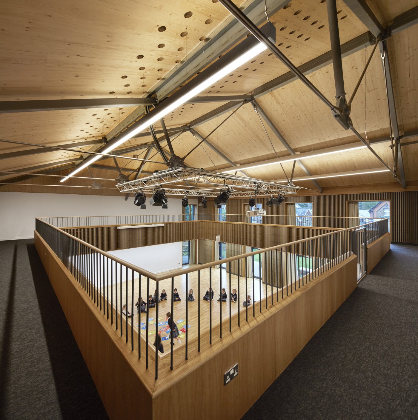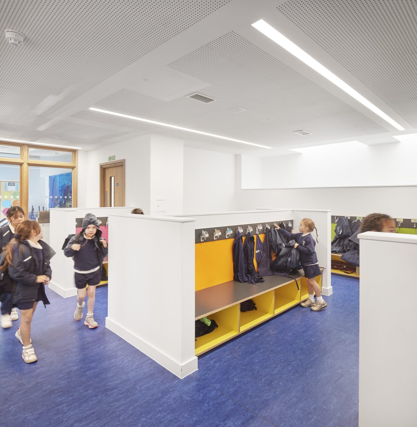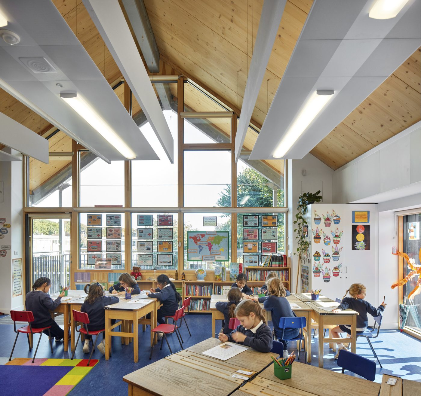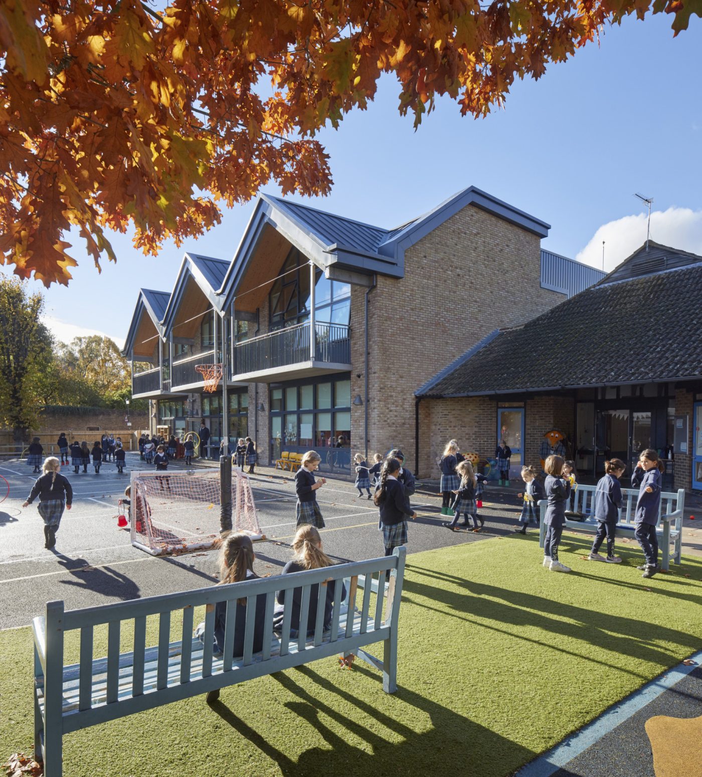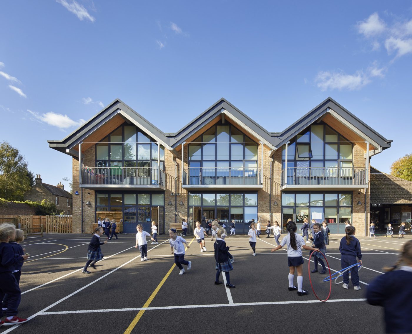 Light and airy classrooms are arranged over two floors, overlooking the playground, with cloaks and toilets easily accessible from the classrooms. Direct access to outside space is achieved by the introduction of balconies at first floor level.