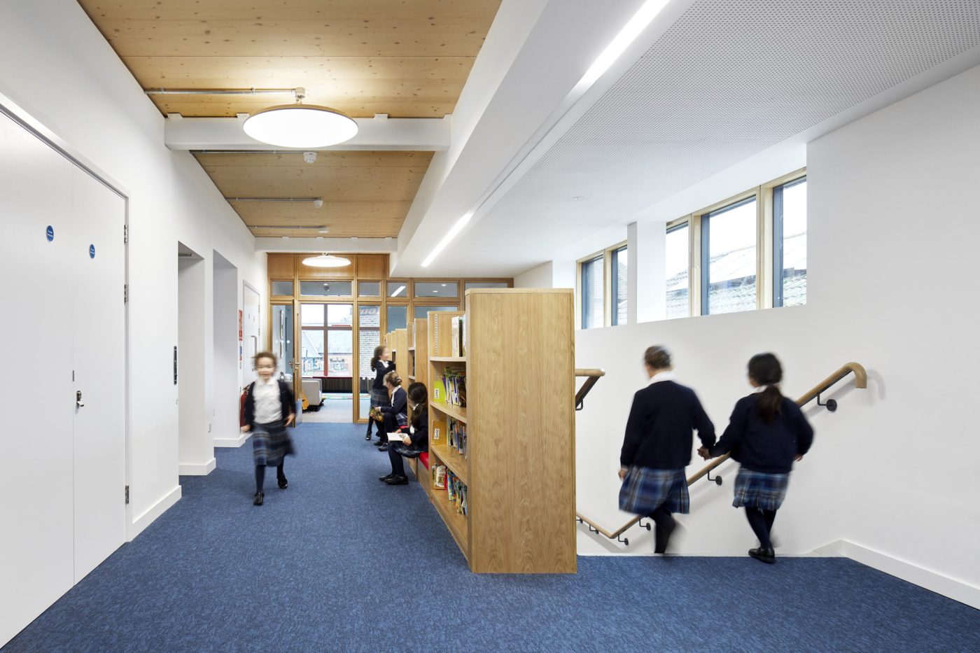 An inviting, naturally day-lit staircase leads to the upper floor where the library is located, in a prominent position placing learning at the forefront of the arrival to school.
