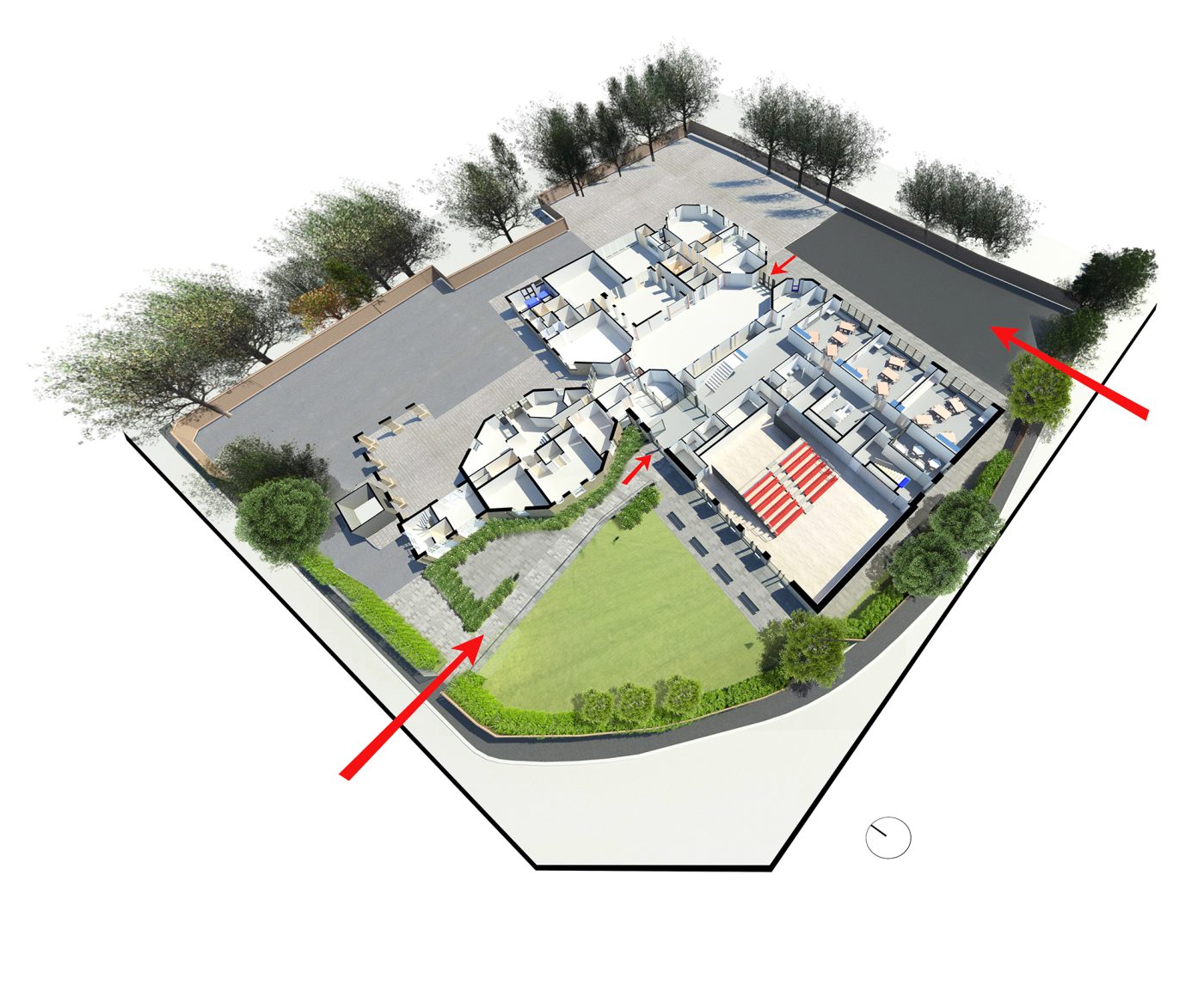 Double height windows march along the hall façade. Three traditional pitched gables articulate the classroom wing. The roofs project to provide both shade to the classrooms and the support structure to the first floor balconies.