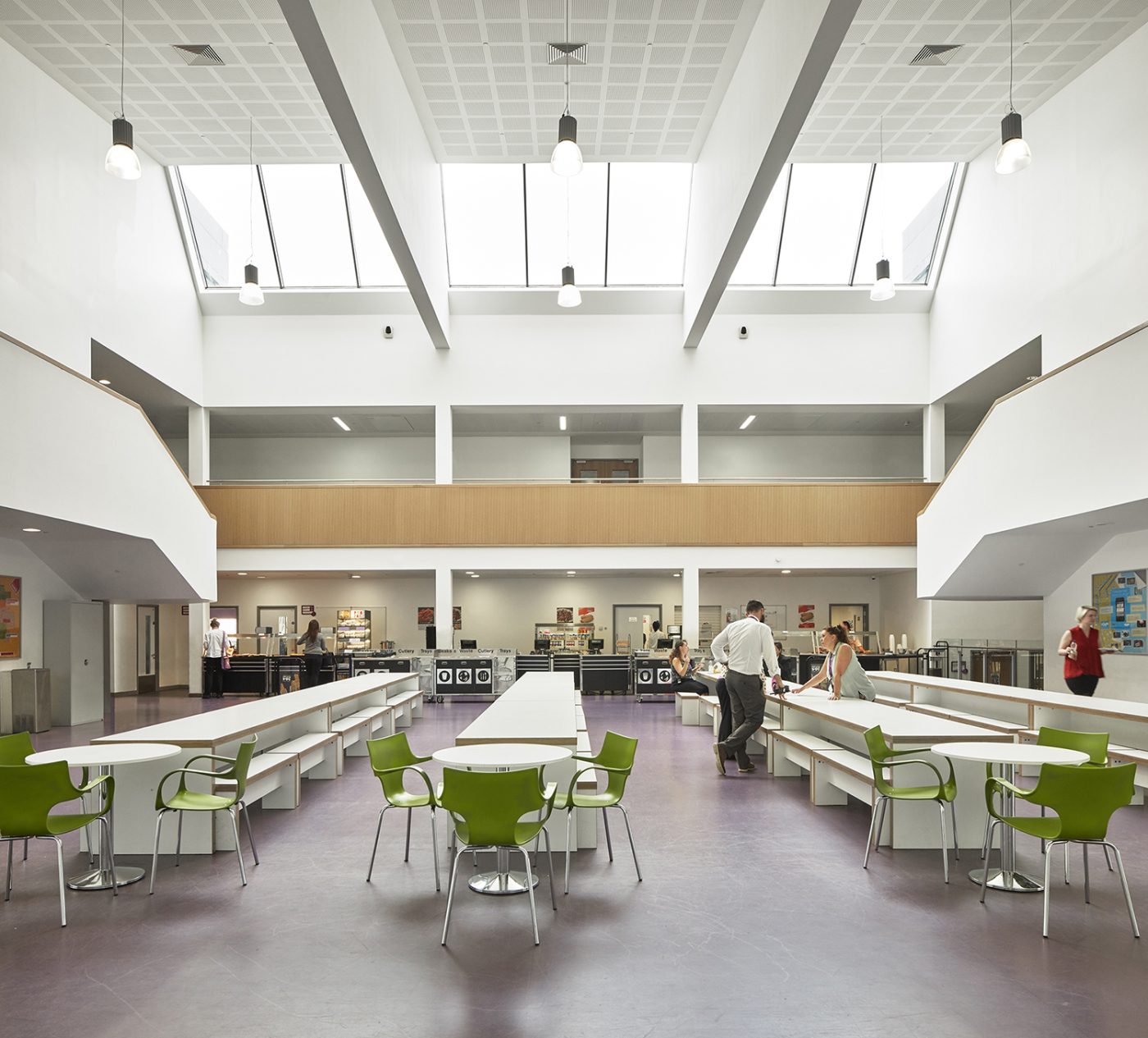 The compact plan places a performance hub at the heart of the school. The central atrium is double height with a glazed northlight. It is linked to the Performance Hall with a large sliding stacking partition so the two spaces can be joined into one larger space.